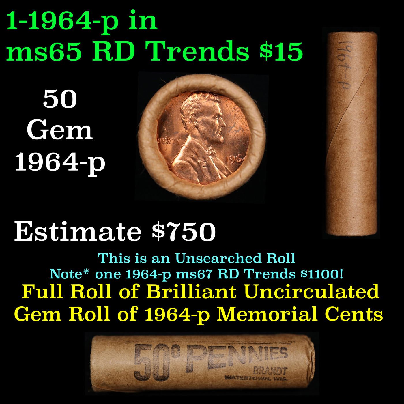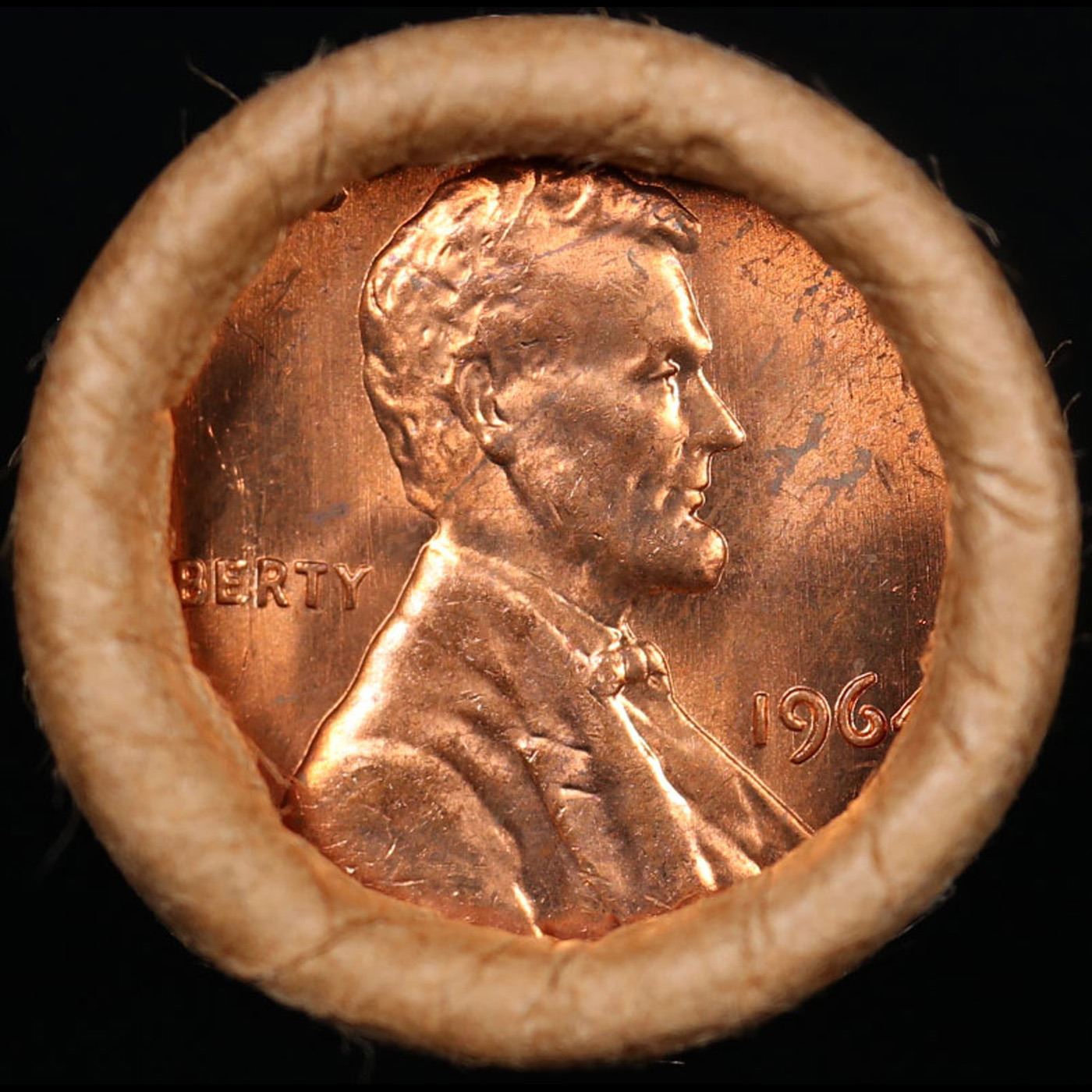 Shotgun Lincoln 1c roll, 1964-P 50 pcs Brandt Wrapper.. A terrific Shotgun roll of Lincoln cents. Most if not all coin should be cherry red.