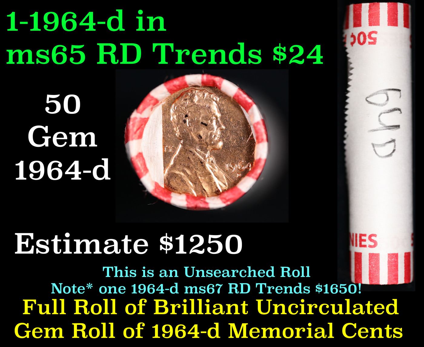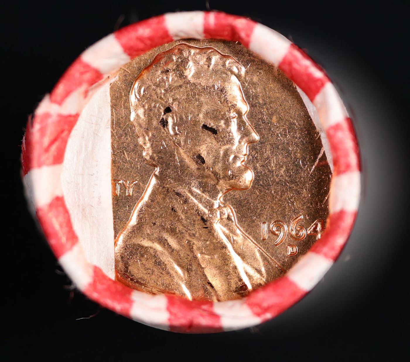 Shotgun Lincoln 1c roll, 1964-d 50 pcs Bank Wrapper.. A terrific Shotgun roll of Lincoln cents. Most if not all coin should be cherry red.