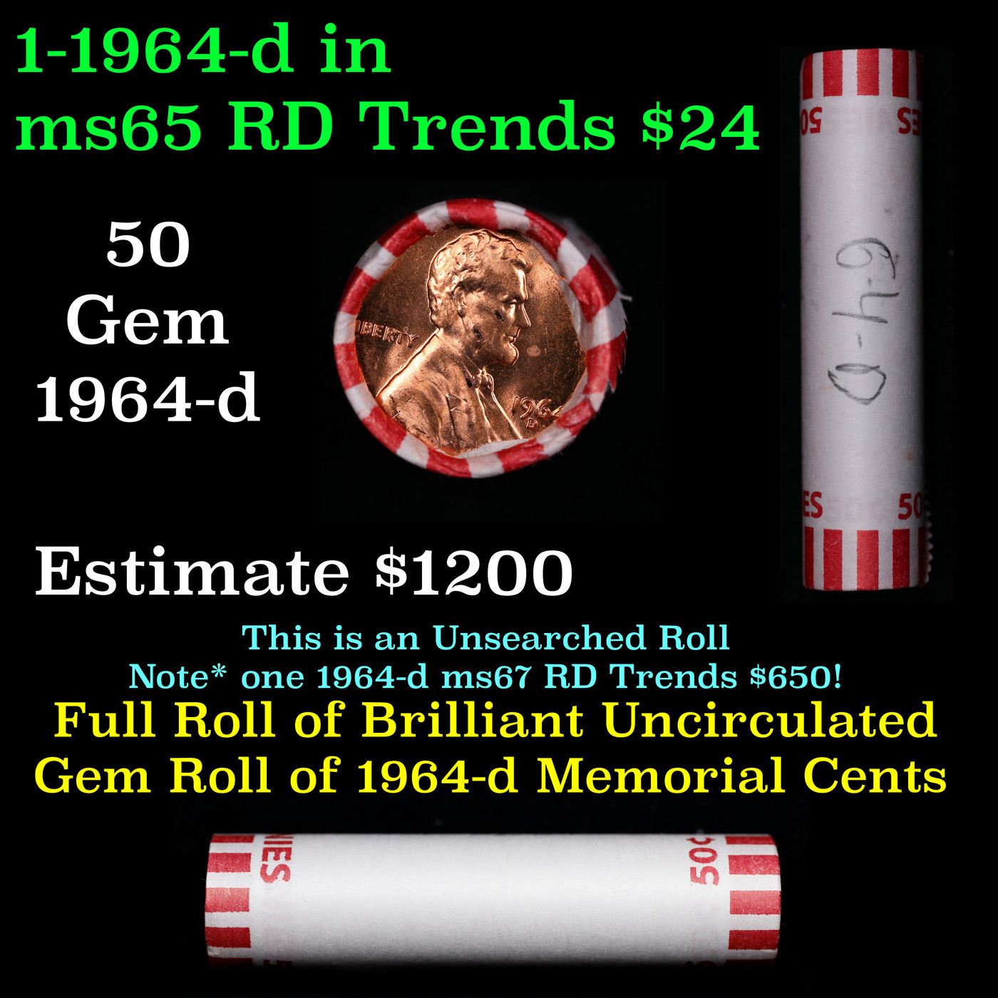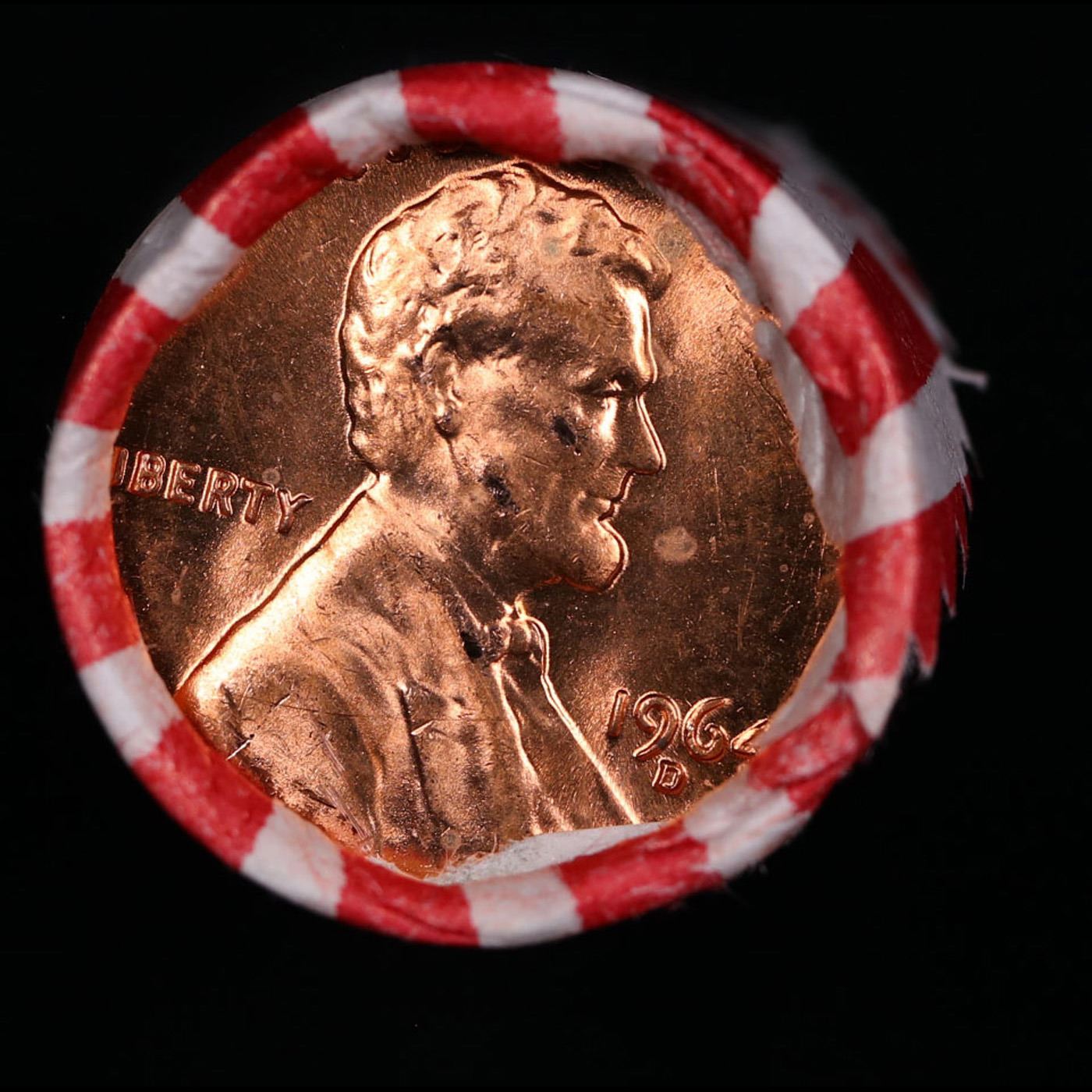 Shotgun Lincoln 1c roll, 1964-d 50 pcs Bank Wrapper.. A terrific Shotgun roll of Lincoln cents. Most if not all coin should be cherry red.