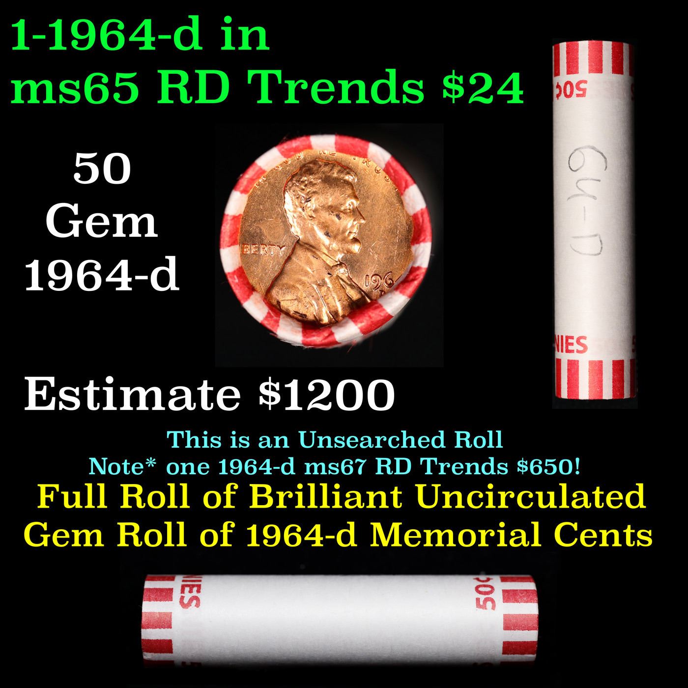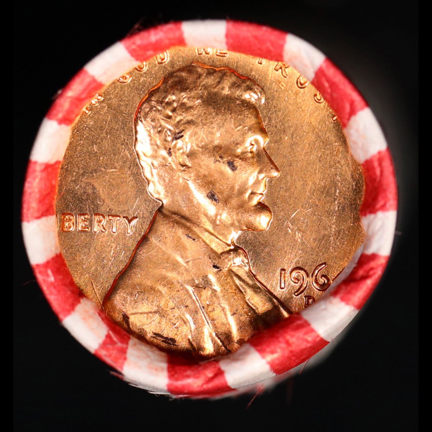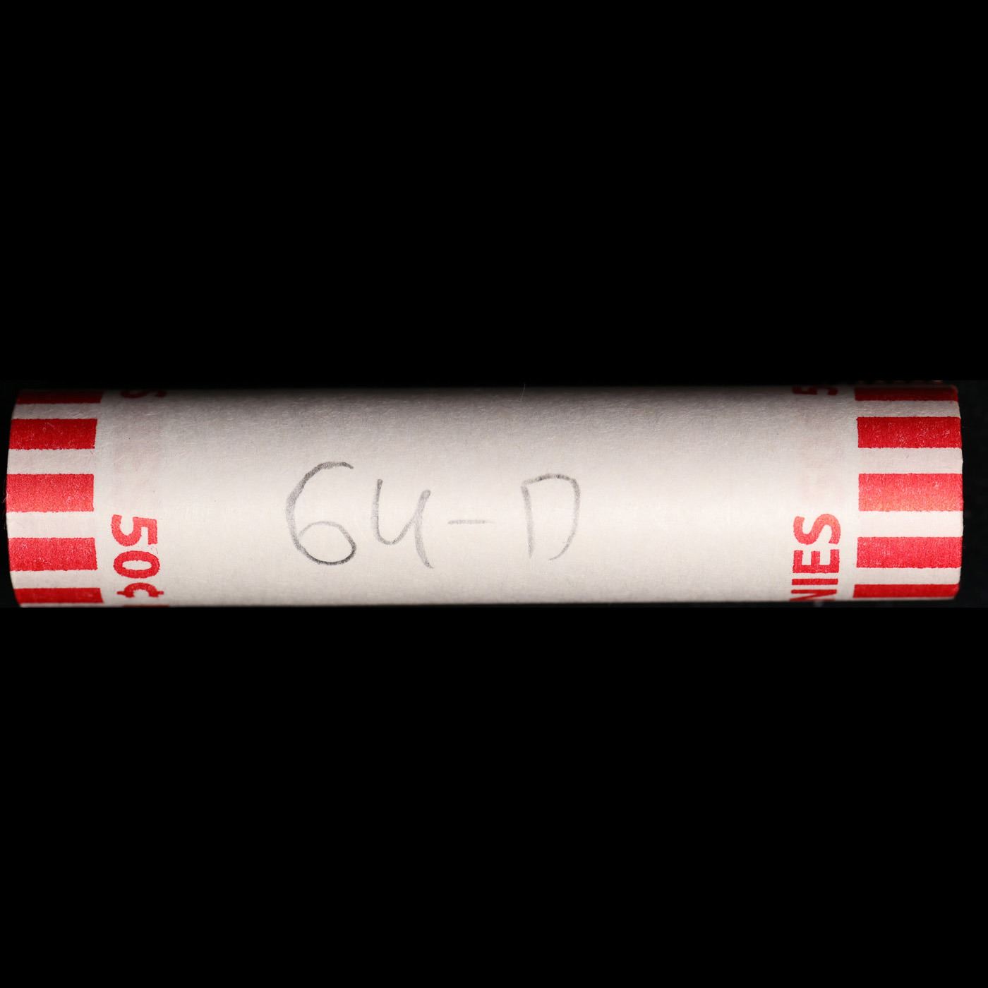 Shotgun Lincoln 1c roll, 1964-d 50 pcs Bank Wrapper.. A terrific Shotgun roll of Lincoln cents. Most if not all coin should be cherry red.