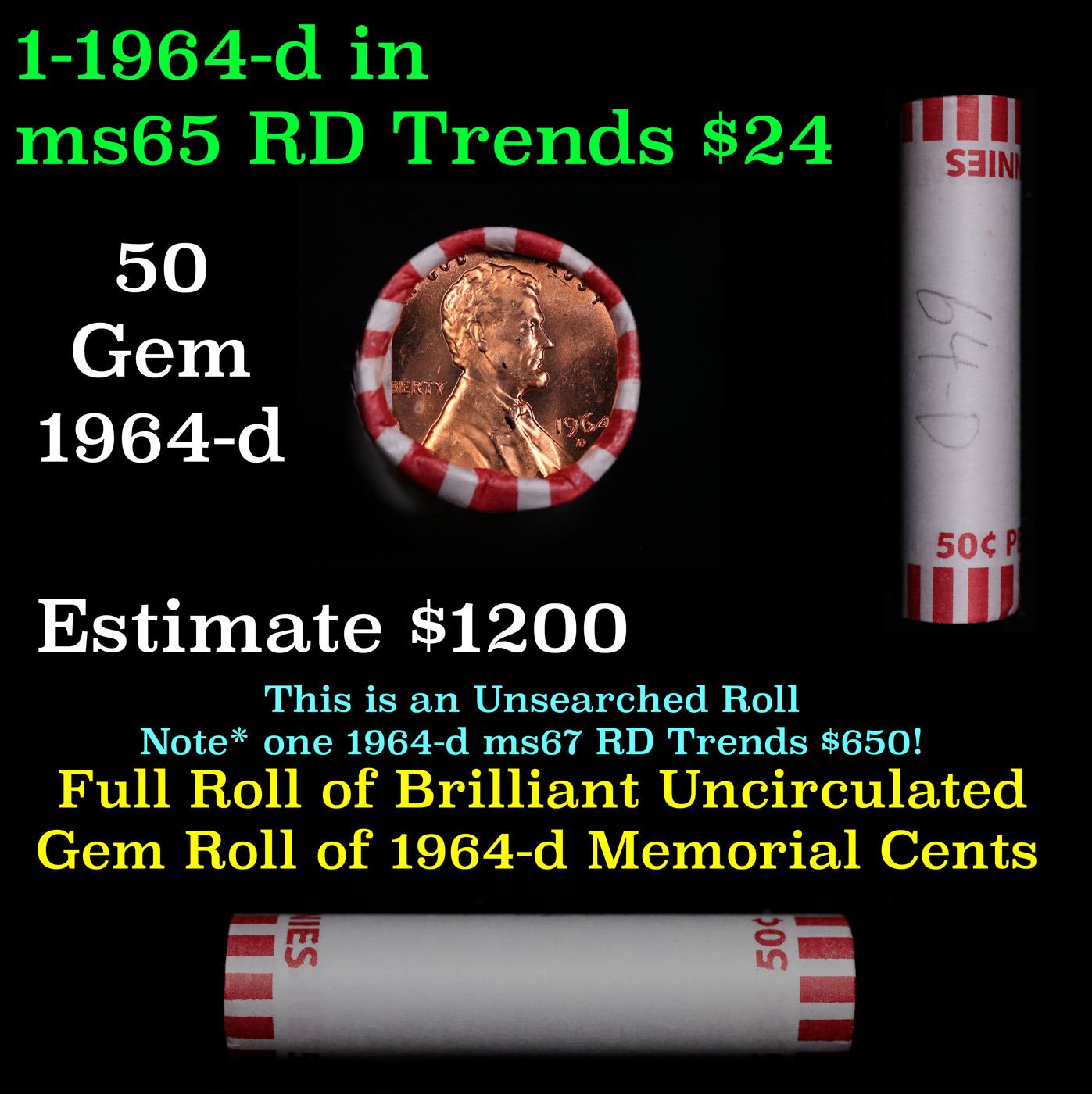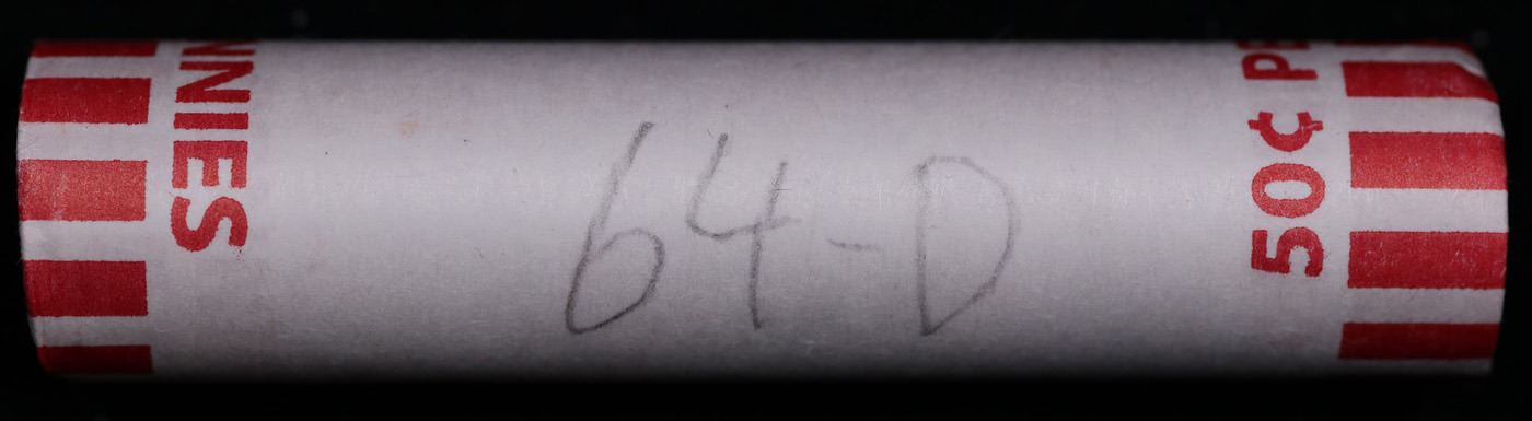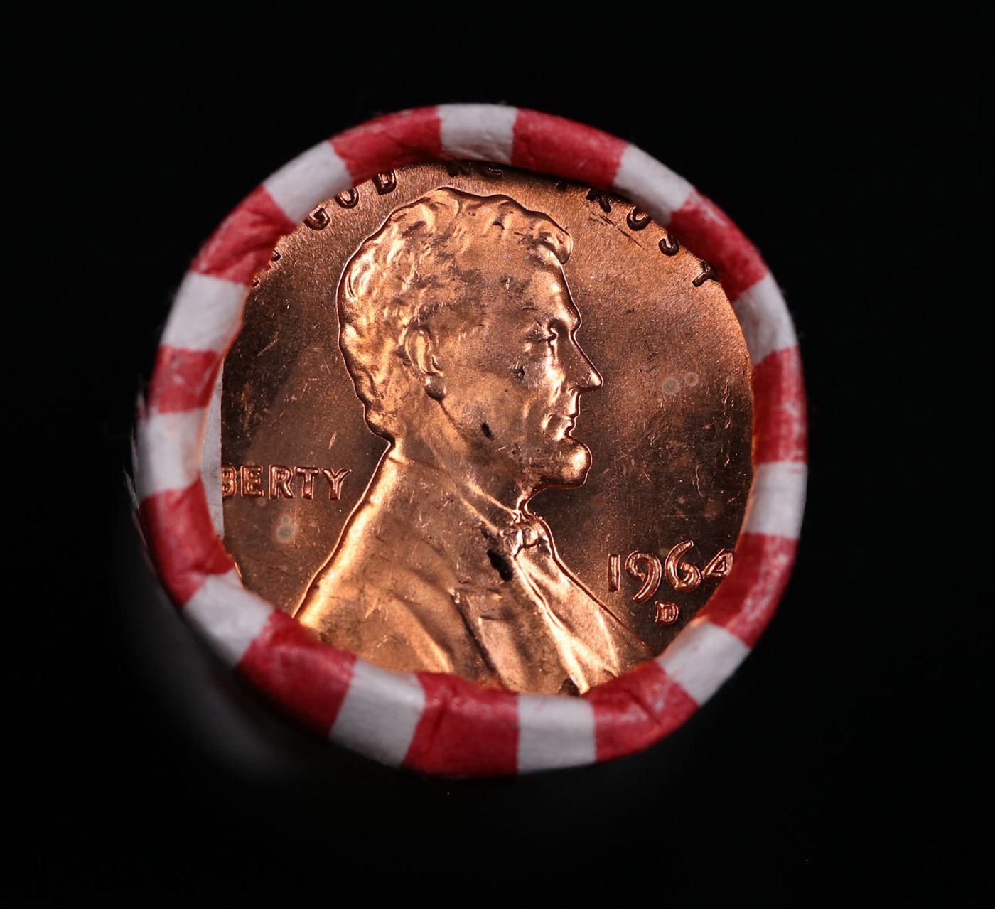 Shotgun Lincoln 1c roll, 1964-d 50 pcs Bank Wrapper.. A terrific Shotgun roll of Lincoln cents. Most if not all coin should be cherry red.