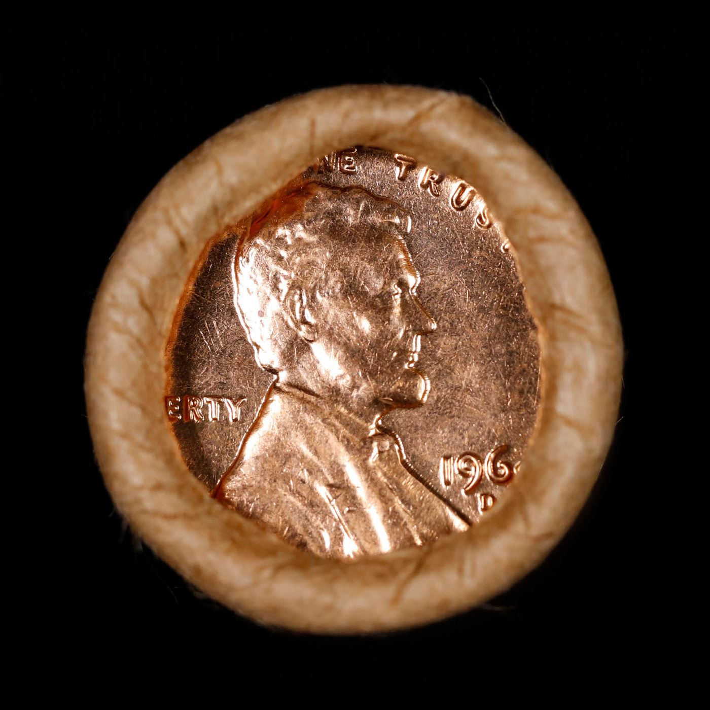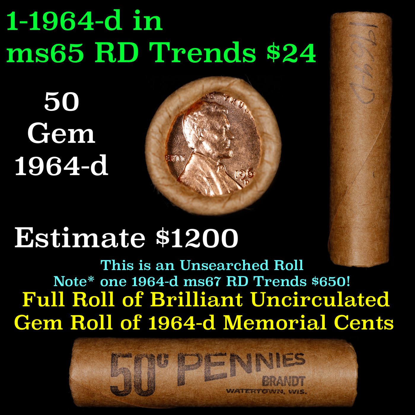 Shotgun Lincoln 1c roll, 1964-d 50 pcs Brandt Wrapper . A terrific Shotgun roll of Lincoln cents. All coins appear to be cherry red. Trends ms65 rd $24