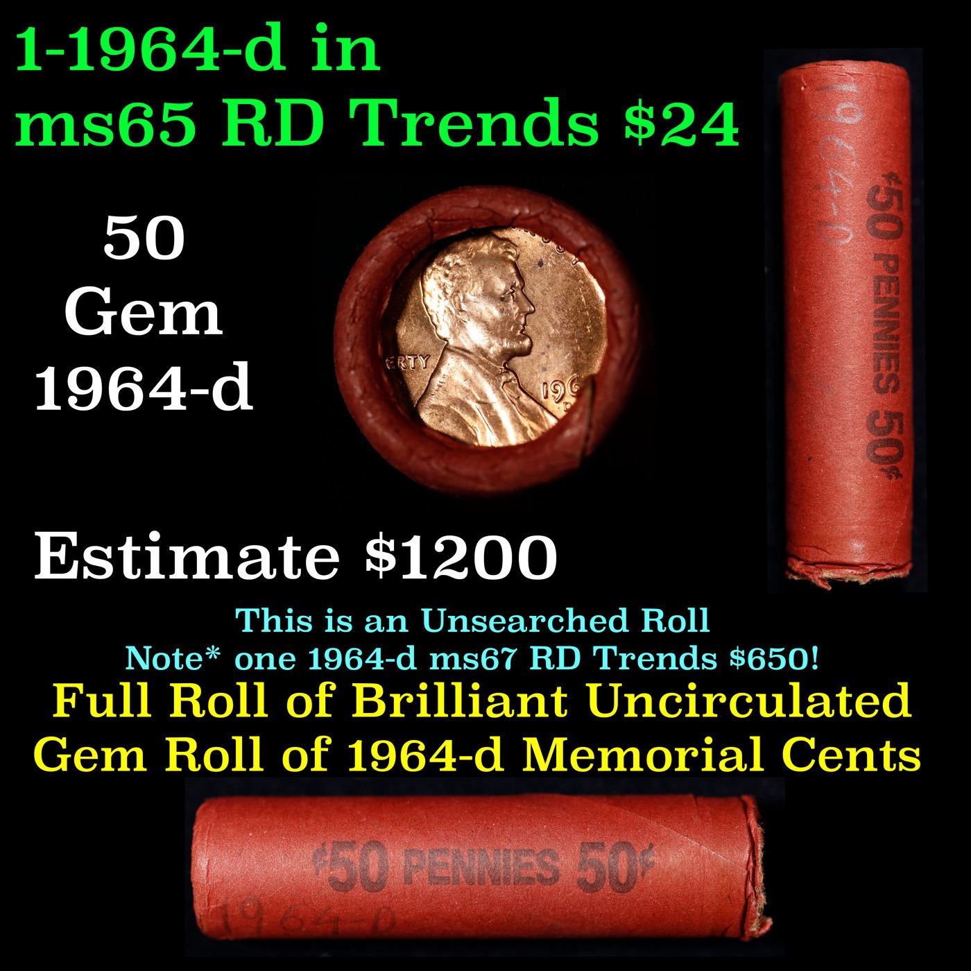Shotgun Lincoln 1c roll, 1964-d 50 pcs Wrapper.. A terrific Shotgun roll of Lincoln cents. Most if not all coin should be cherry red. Trends ms65 rd $24