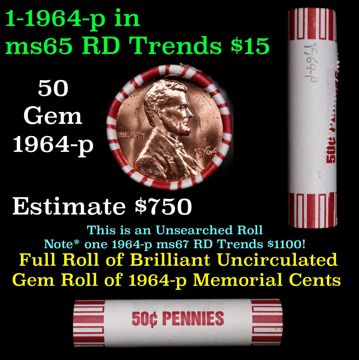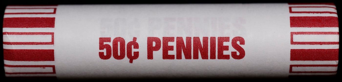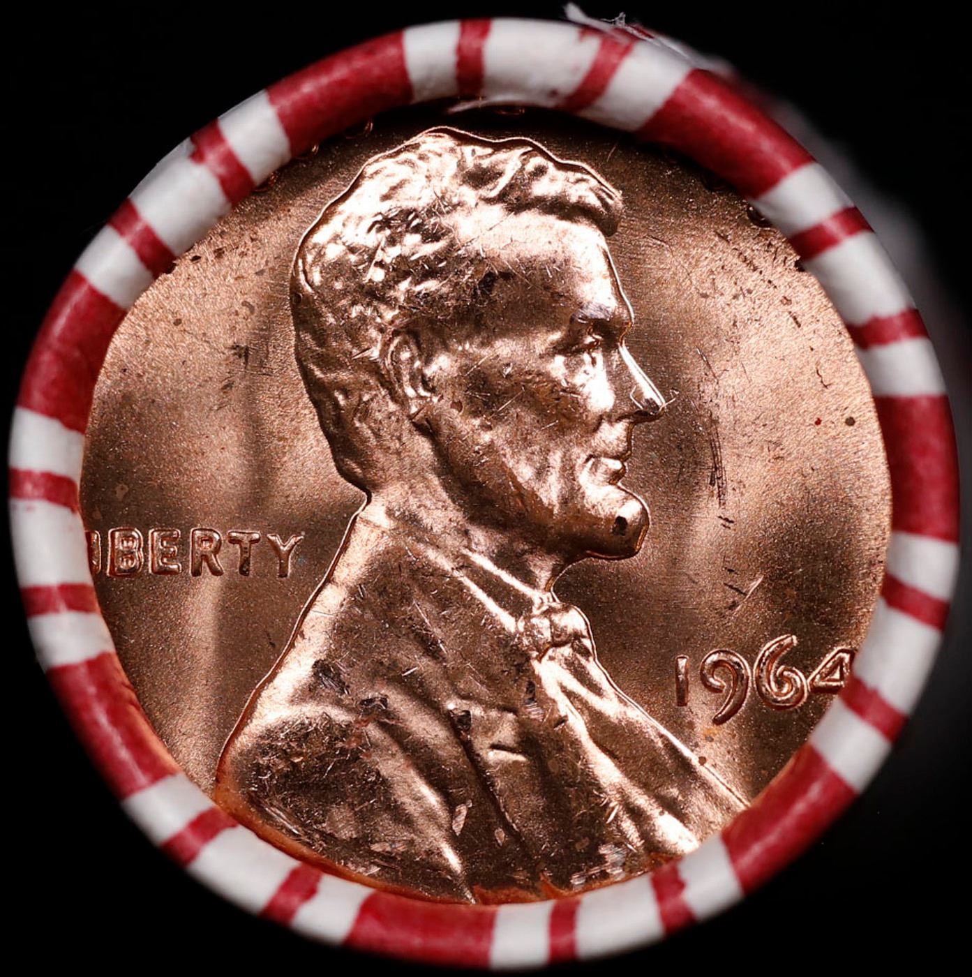 Shotgun Lincoln 1c roll, 1964-p 50 pcs Bank 50c Wrapper.. A terrific Shotgun roll of Lincoln cents. Most if not all coin should be cherry red.