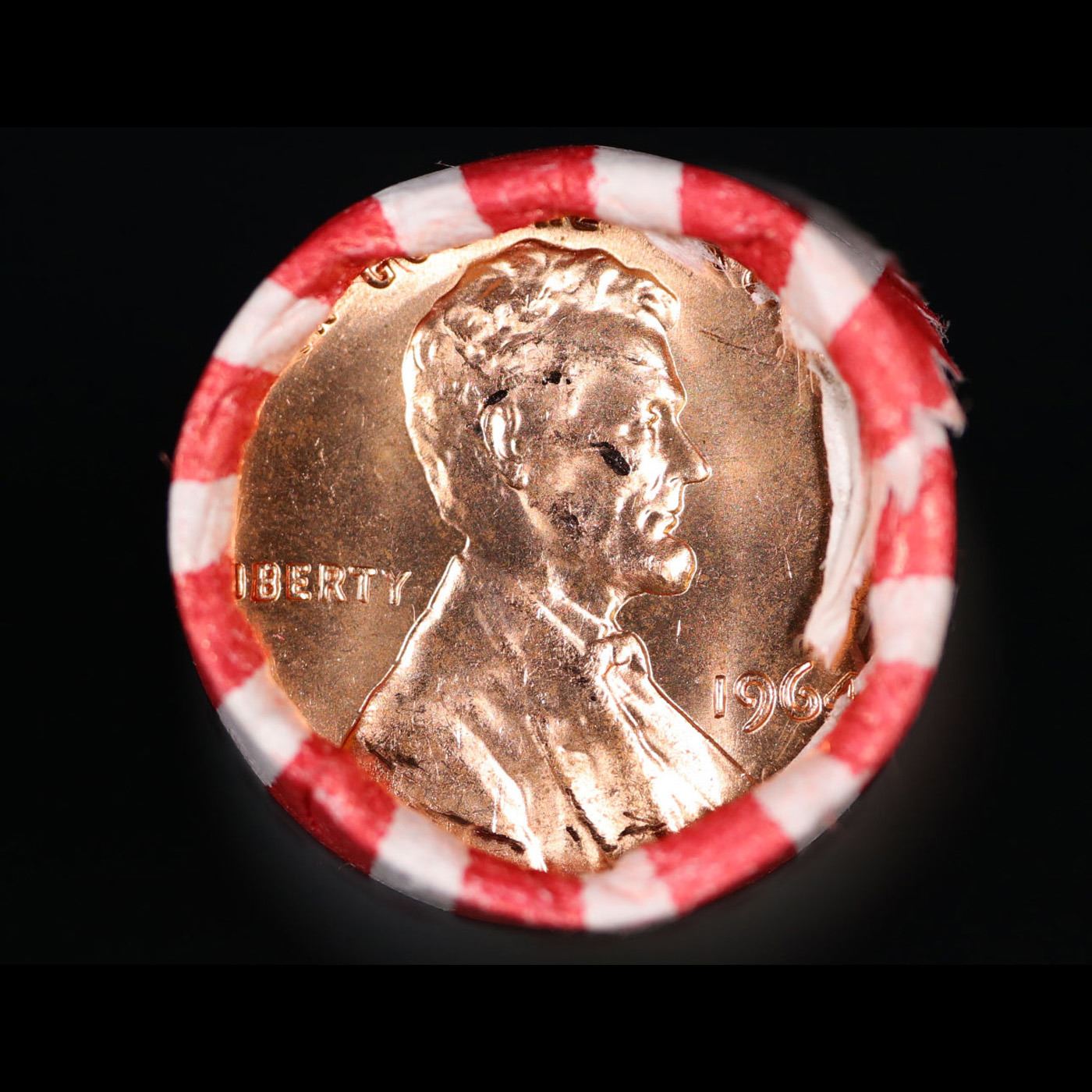 Shotgun Lincoln 1c roll, 1964-p 50 pcs Bank Wrapper.. A terrific Shotgun roll of Lincoln cents. Most if not all coin should be cherry red.
