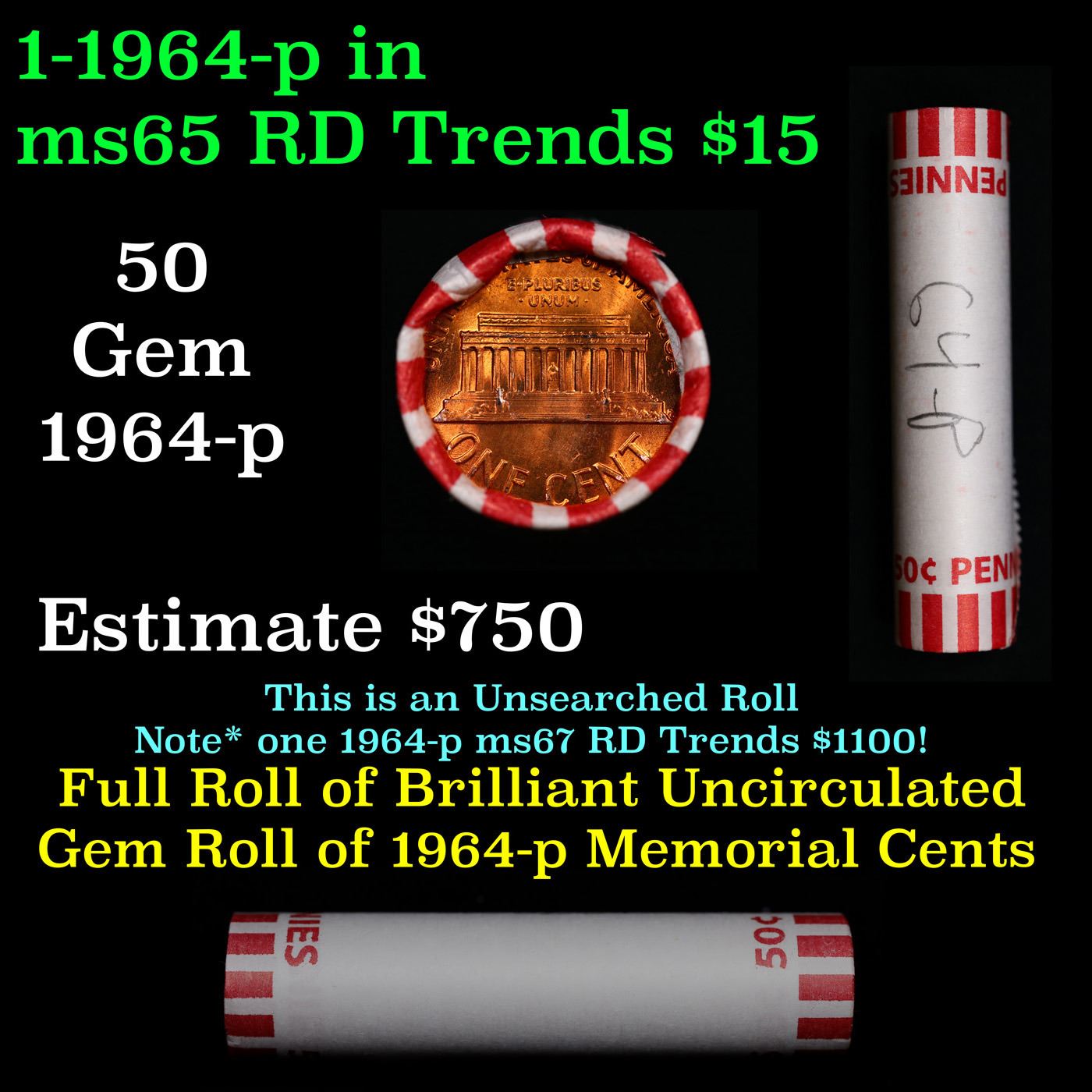 Shotgun Lincoln 1c roll, 1964-p 50 pcs Bank Wrapper.