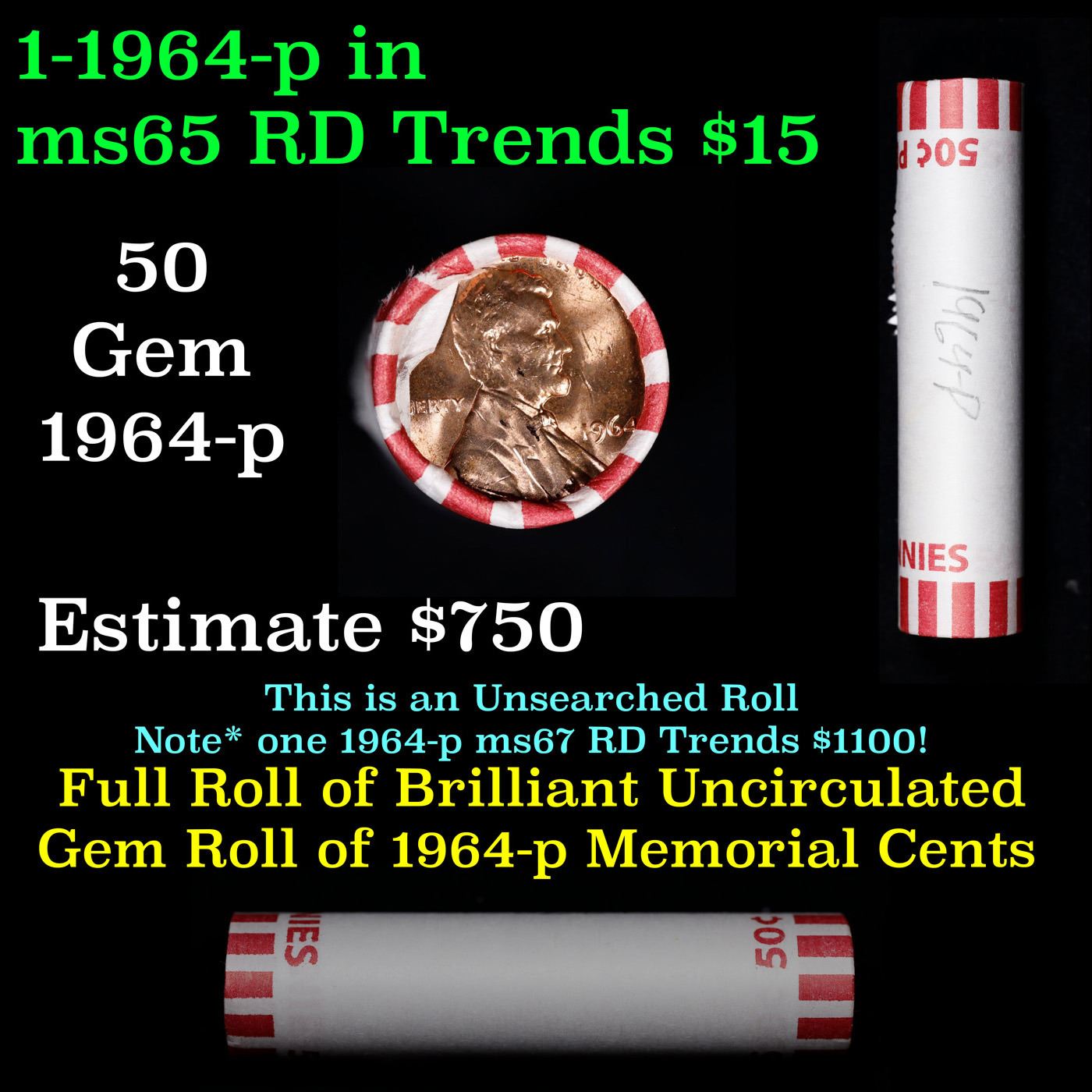 Shotgun Lincoln 1c roll, 1964-p 50 pcs Bank Wrapper.. A terrific Shotgun roll of Lincoln cents. Most if not all coin should be cherry red.