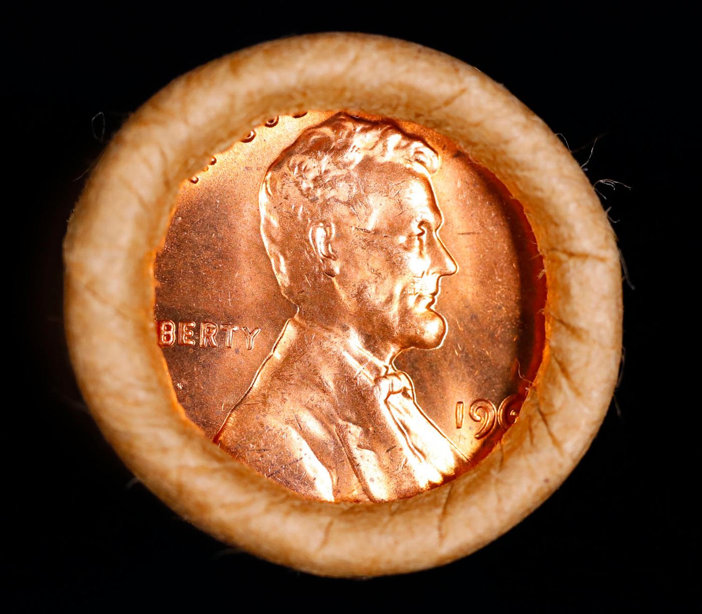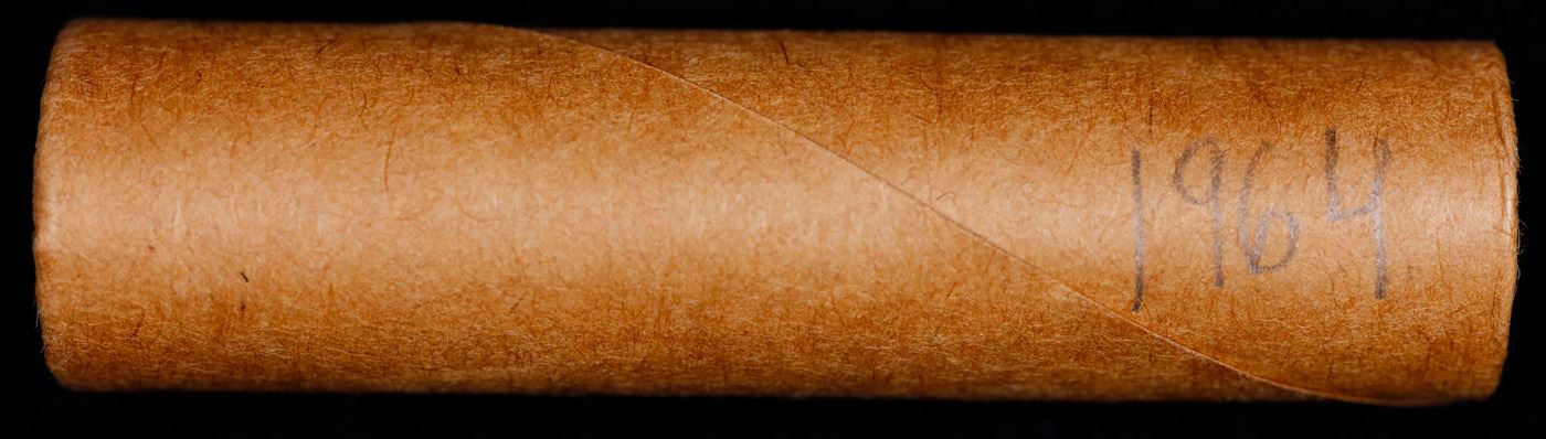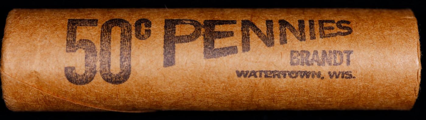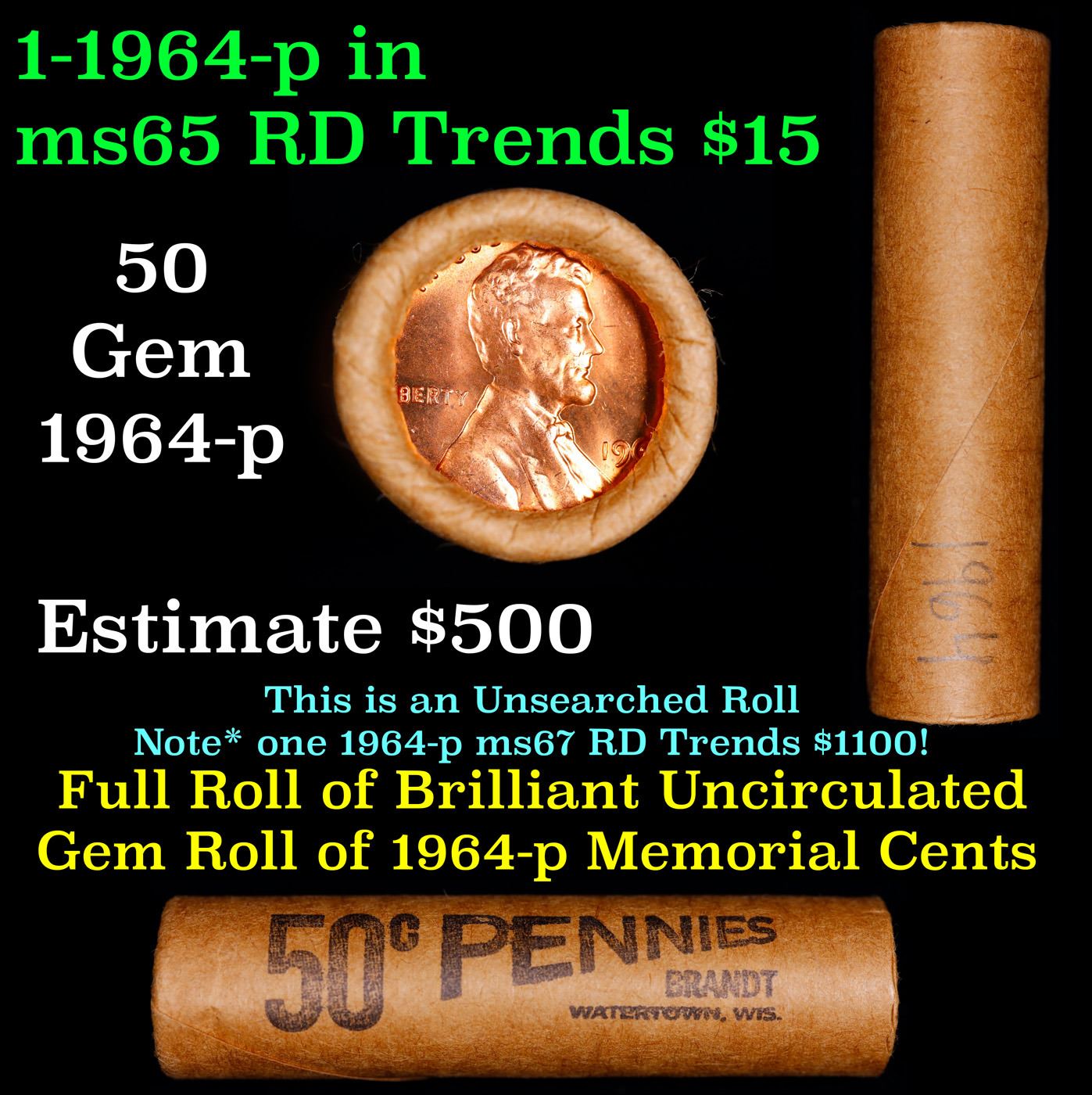 Shotgun Lincoln 1c roll, 1964-p 50 pcs Brandt Wrapper . A terrific Shotgun roll of Lincoln cents. All coins appear to be cherry red. Trends ms65 rd $15