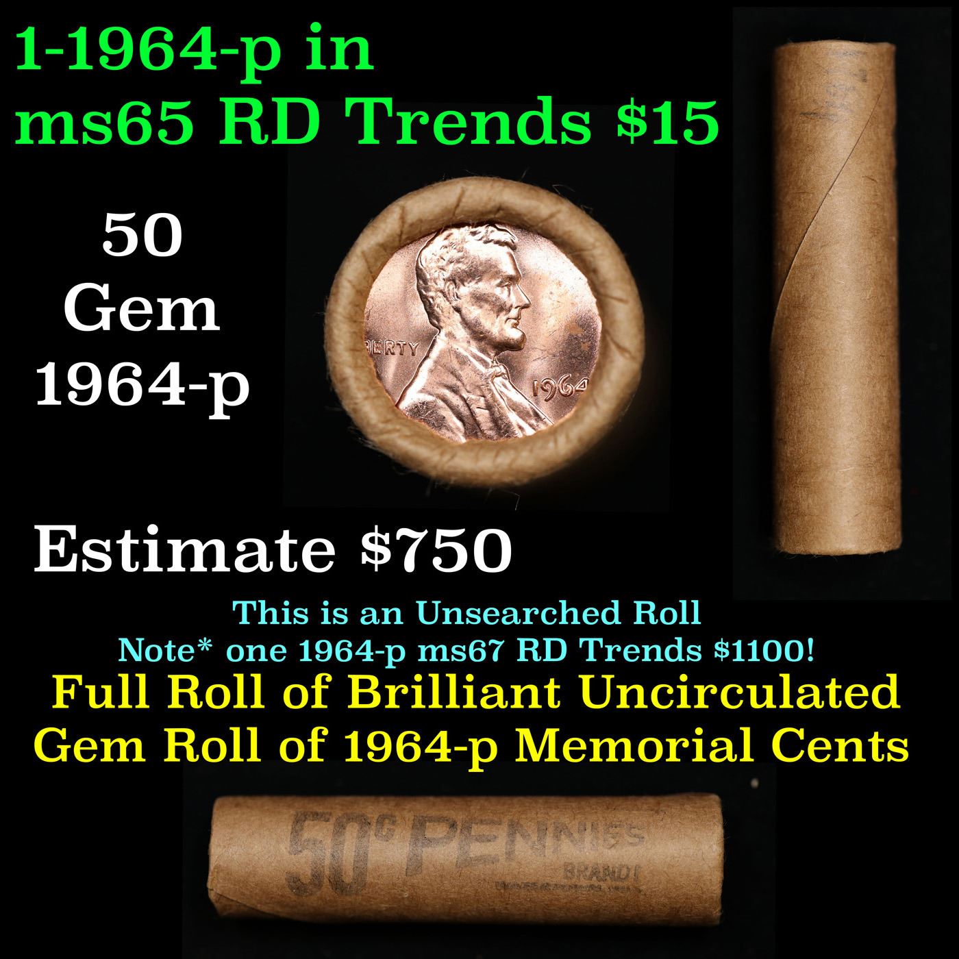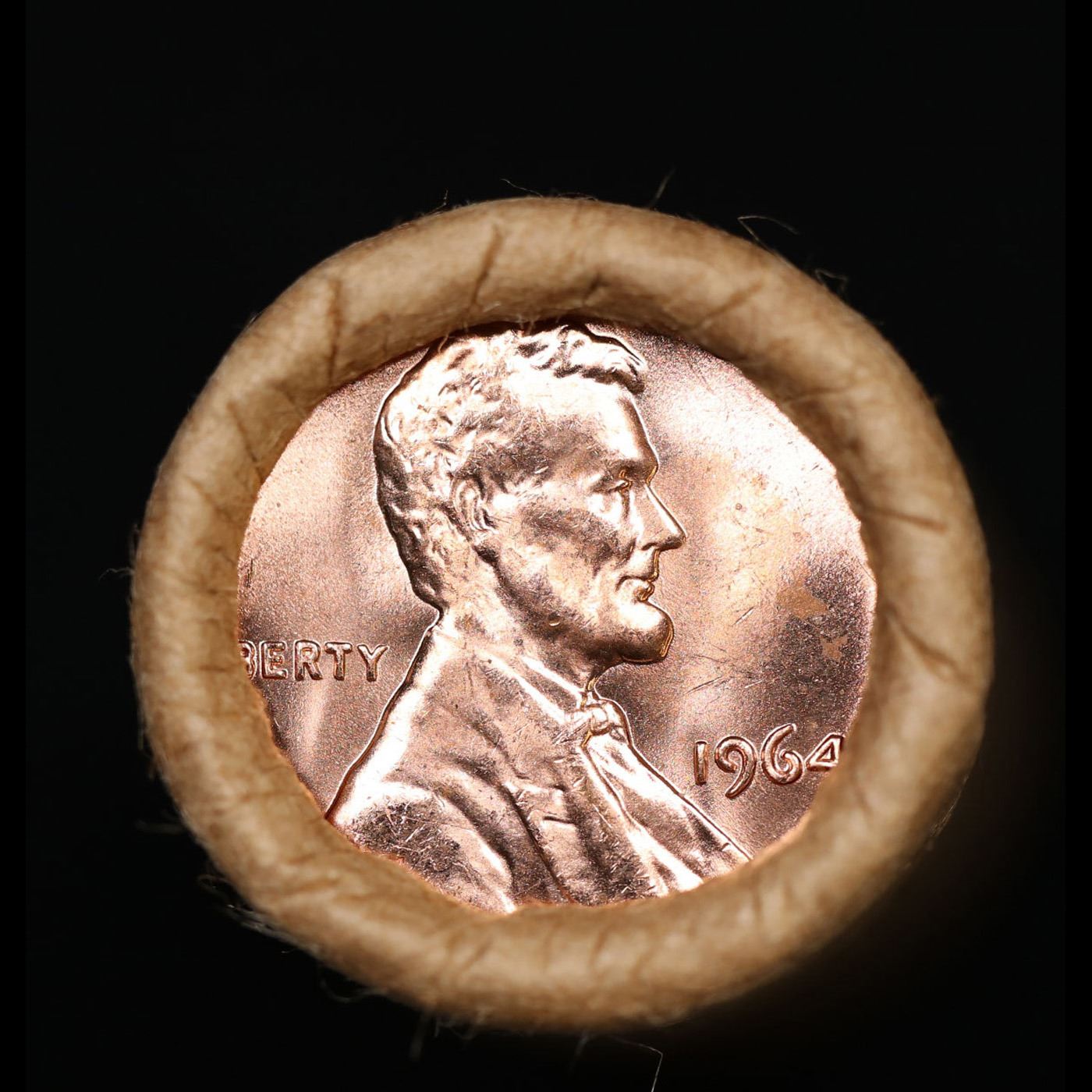 Shotgun Lincoln 1c roll, 1964-p 50 pcs Brandt Wrapper.. A terrific Shotgun roll of Lincoln cents. Most if not all coin should be cherry red. Trends ms65 rd $15