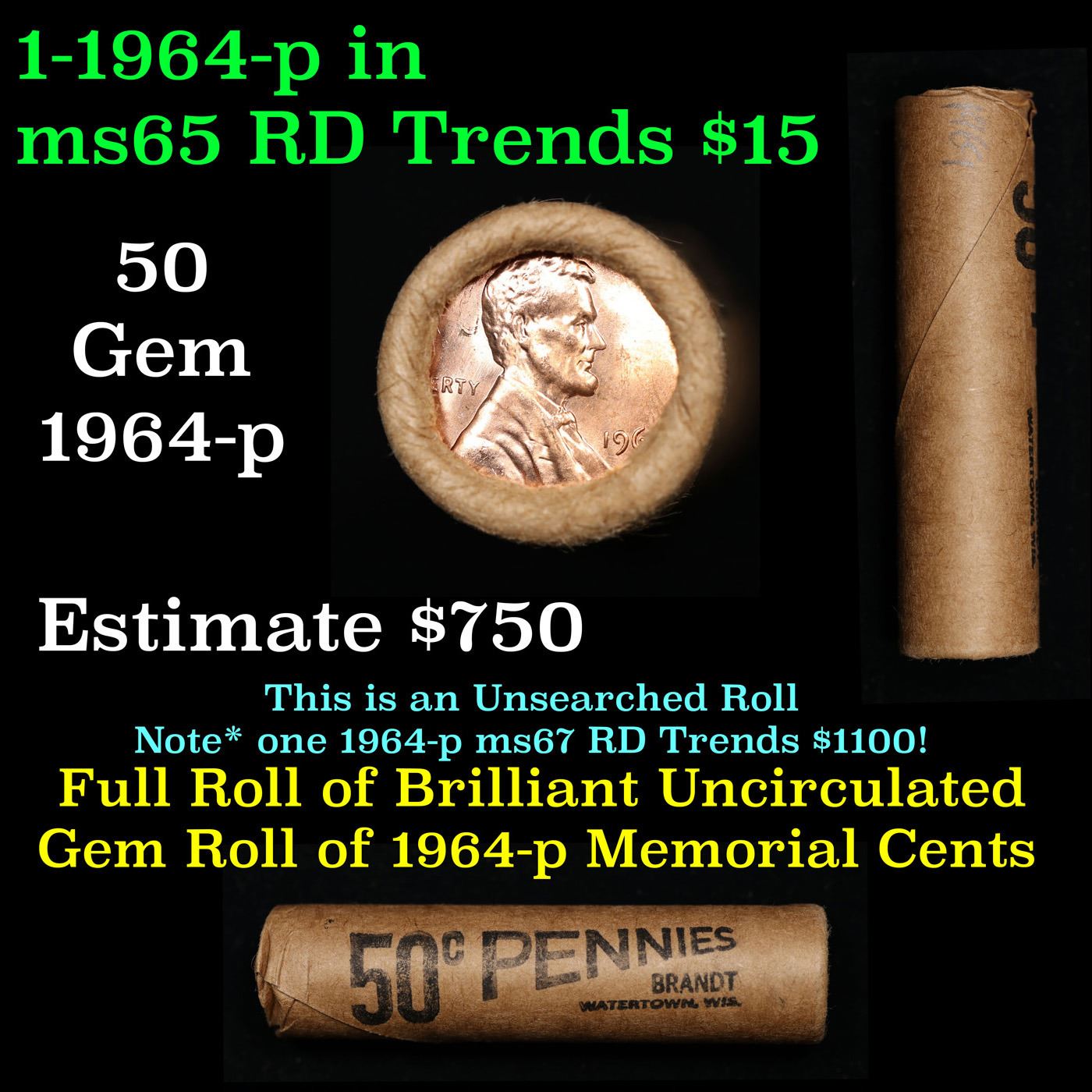 Shotgun Lincoln 1c roll, 1964-p 50 pcs Brandt Wrapper.. A terrific Shotgun roll of Lincoln cents. Most if not all coin should be cherry red. Trends ms65 rd $15