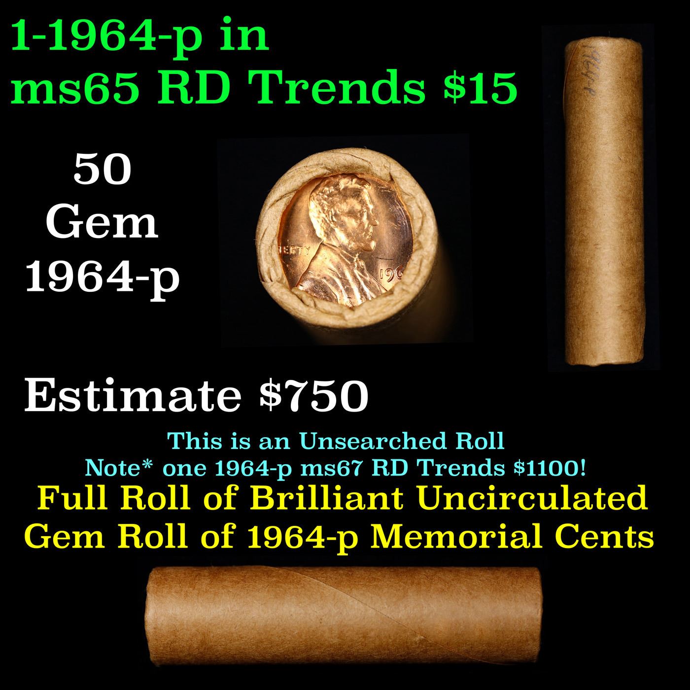 Shotgun Lincoln 1c roll, 1964-p 50 pcs Brandt Wrapper.