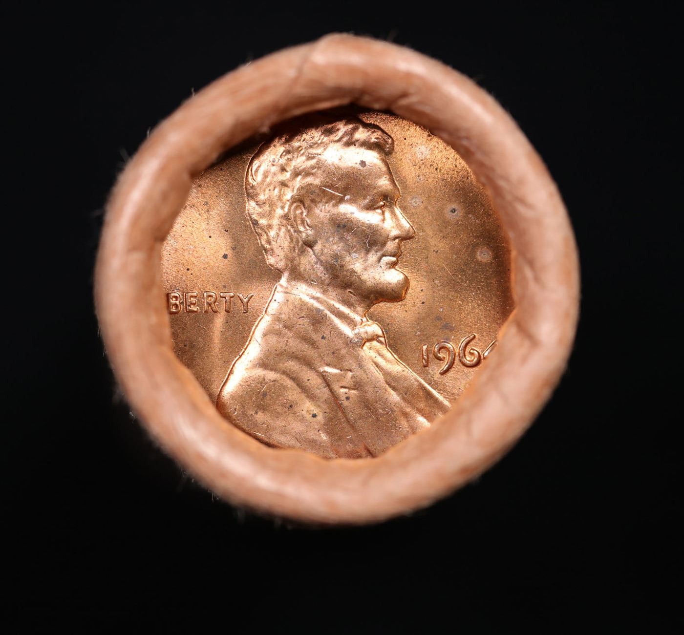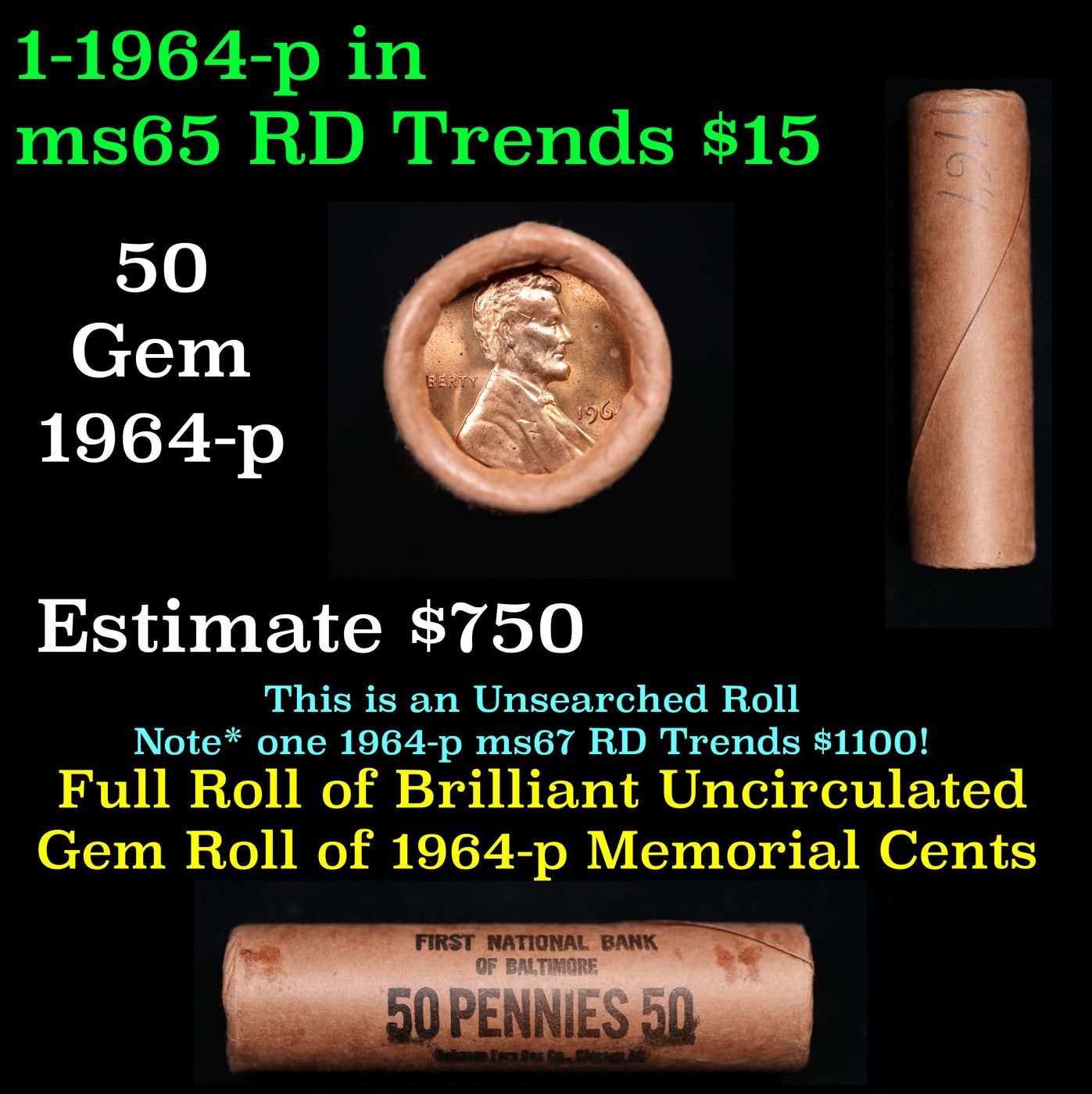 Shotgun Lincoln 1c roll, 1964-p 50 pcs First National Bank of Baltimore Wrapper.. A terrific Shotgun roll of Lincoln cents. Most if not all coin should be cherry red.