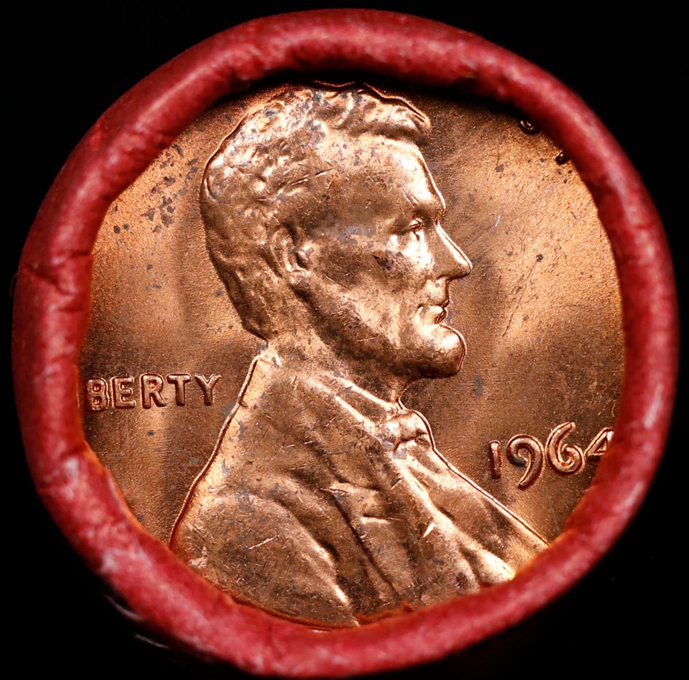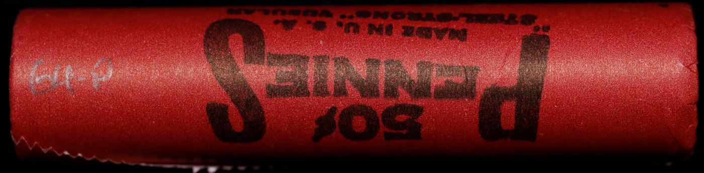 Shotgun Lincoln 1c roll, 1964-p 50 pcs Steel-Strong 50c Wrapper.. A terrific Shotgun roll of Lincoln cents. Most if not all coin should be cherry red.