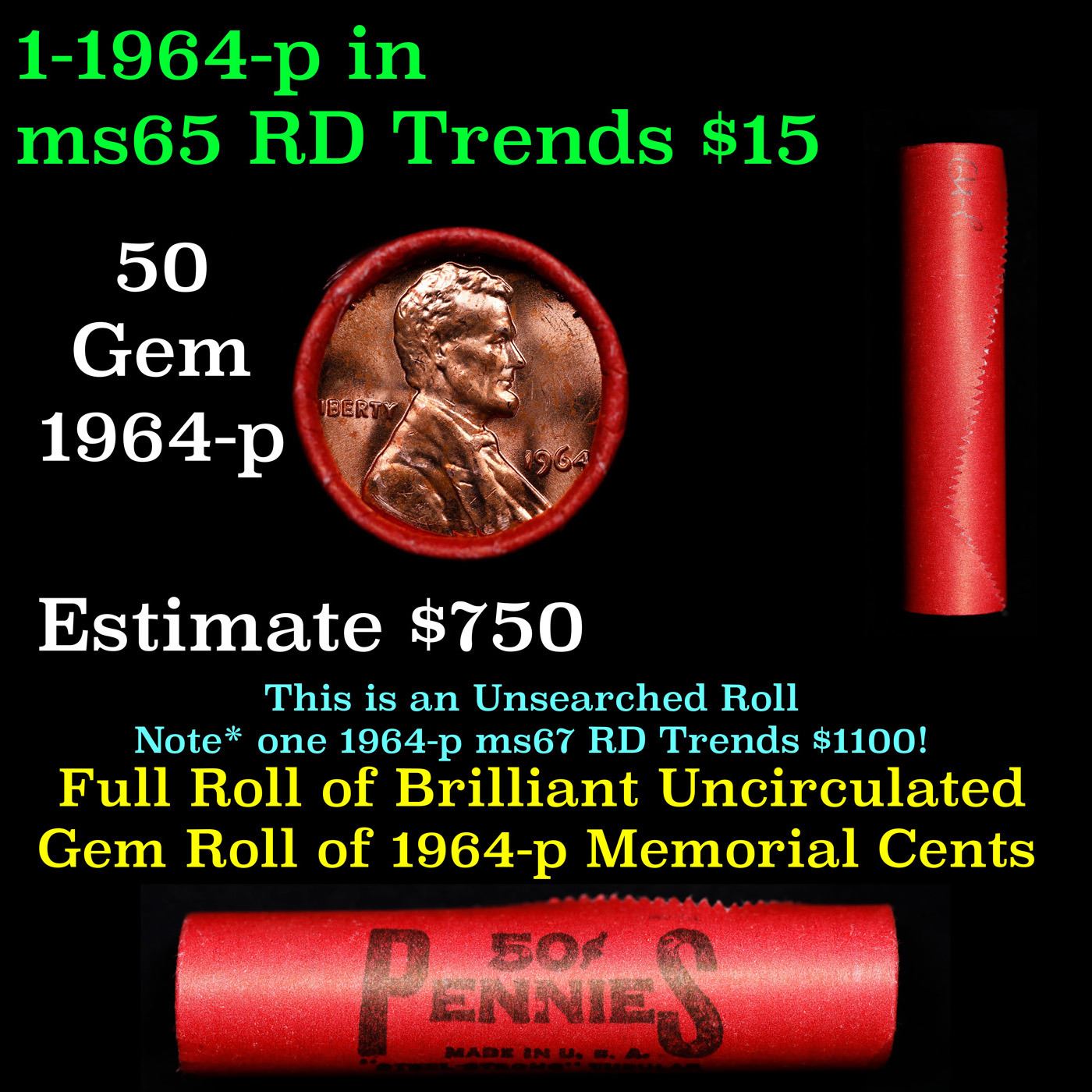 Shotgun Lincoln 1c roll, 1964-p 50 pcs Steel-Strong Wrapper.. A terrific Shotgun roll of Lincoln cents. Most if not all coin should be cherry red.