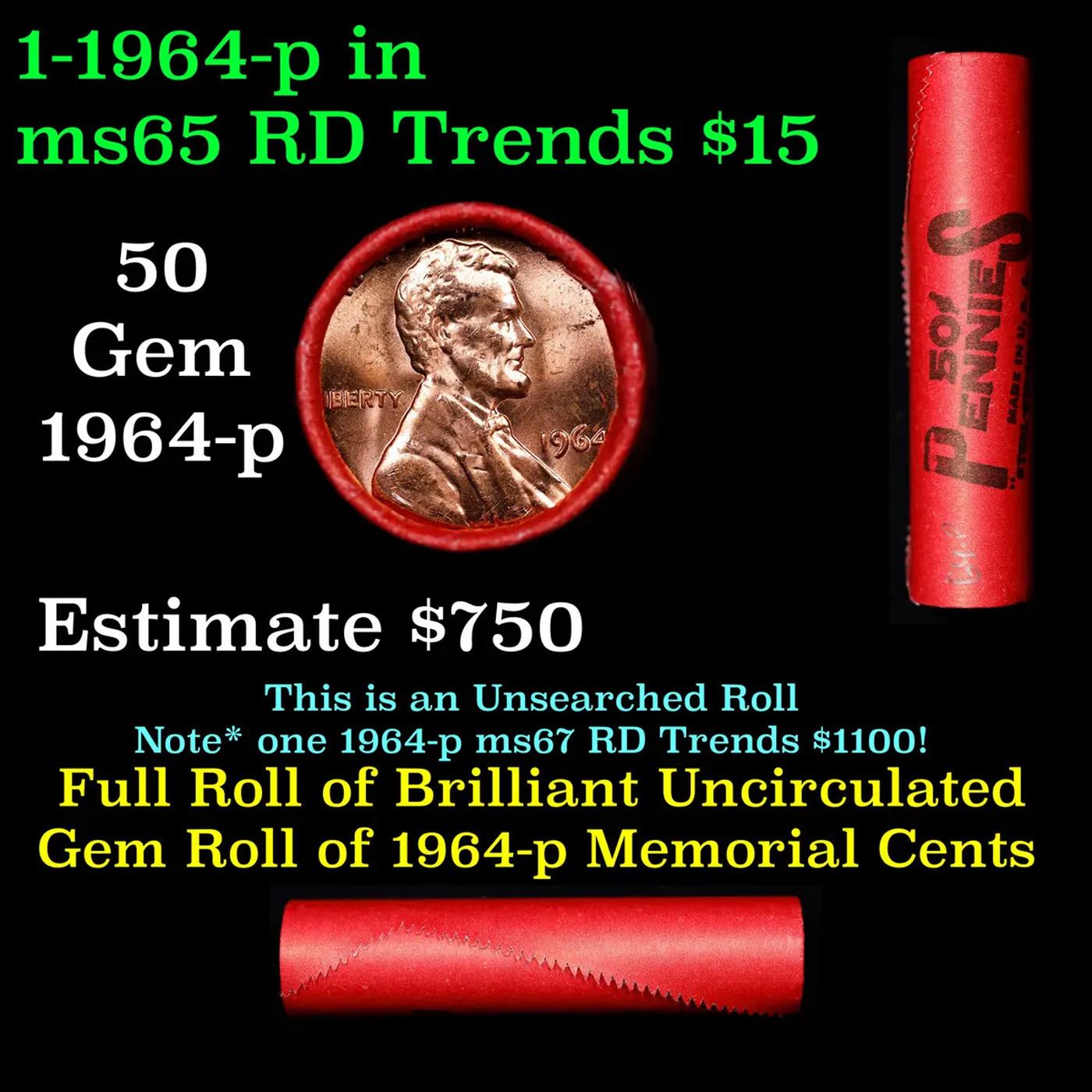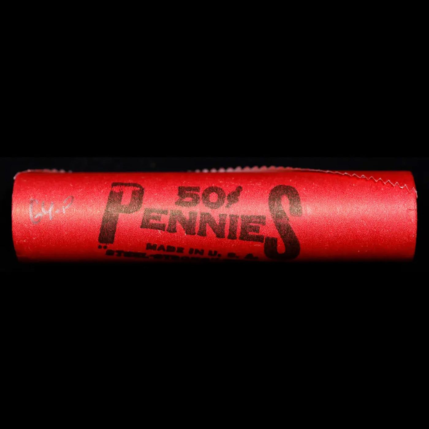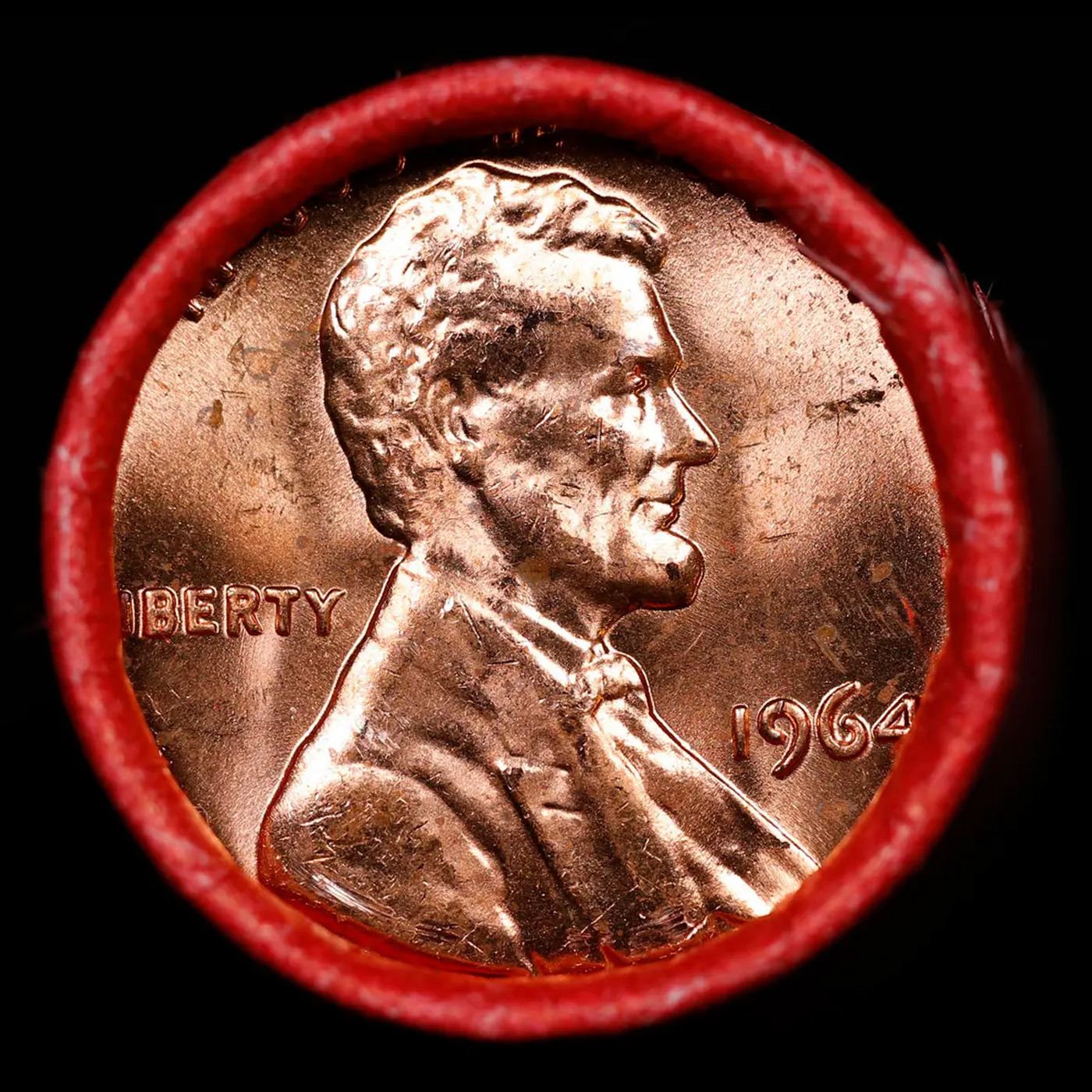 Shotgun Lincoln 1c roll, 1964-p 50 pcs Steel-Strong Wrapper.. A terrific Shotgun roll of Lincoln cents. Most if not all coin should be cherry red.