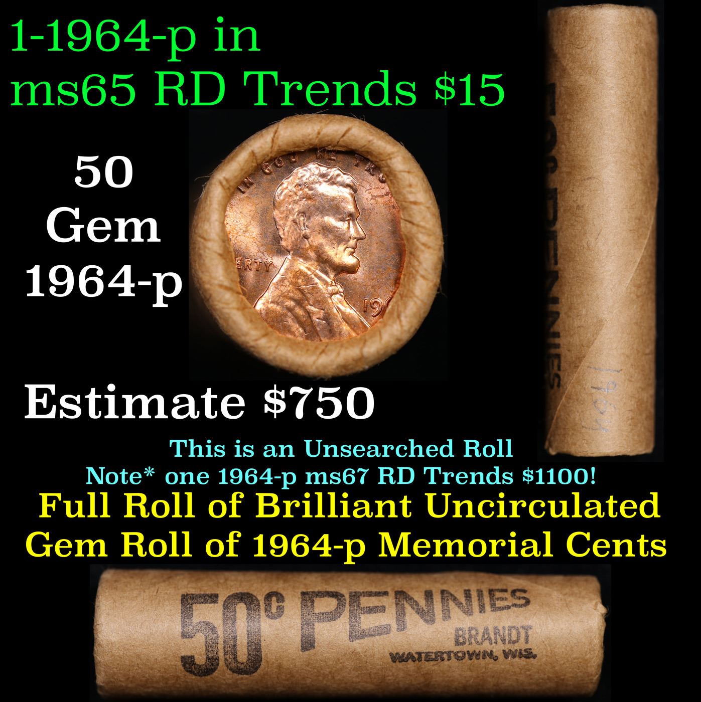 Shotgun Lincoln 1c roll, 1964-p 50 pcs Wrapper . A terrific Shotgun roll of Lincoln cents. All coins cherry red. Trends ms65 rd $15