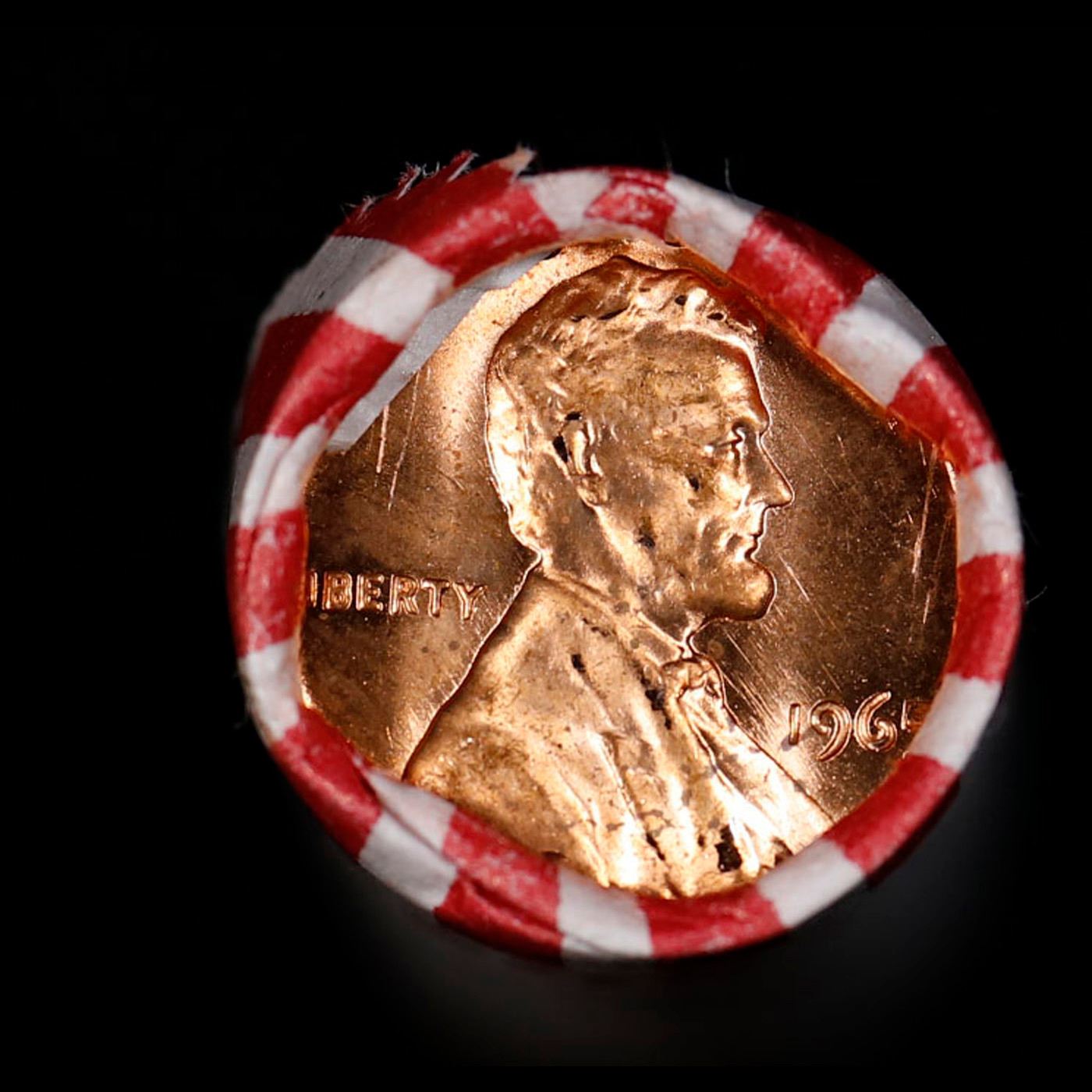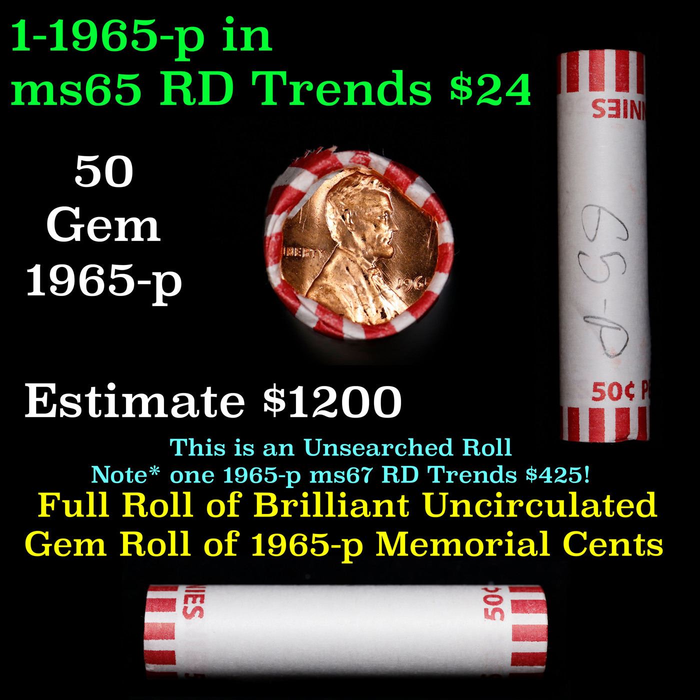 Shotgun Lincoln 1c roll, 1965-p 50 pcs Bank Wrapper.. A terrific Shotgun roll of Lincoln cents. Most if not all coin should be cherry red.