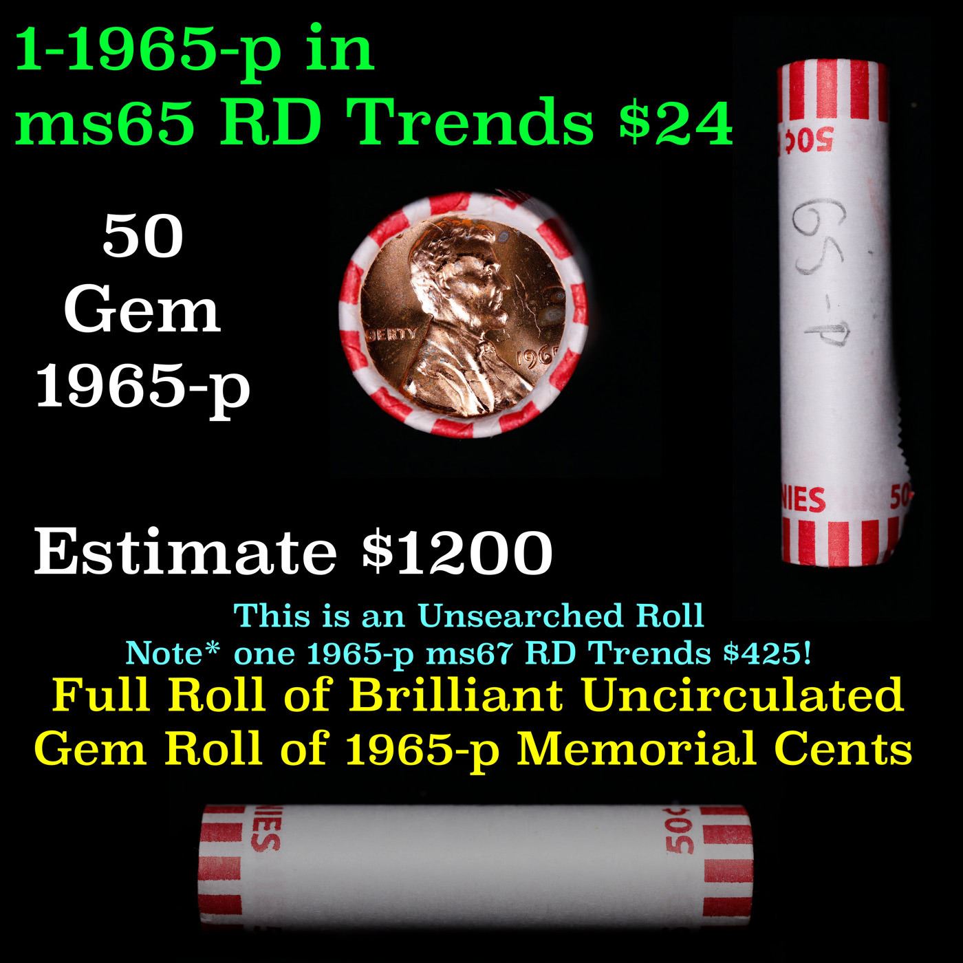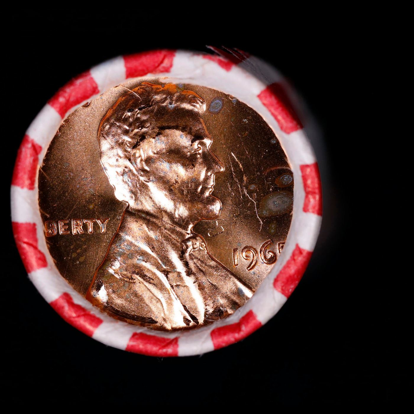 Shotgun Lincoln 1c roll, 1965-p 50 pcs Bank Wrapper.. A terrific Shotgun roll of Lincoln cents. Most if not all coin should be cherry red.