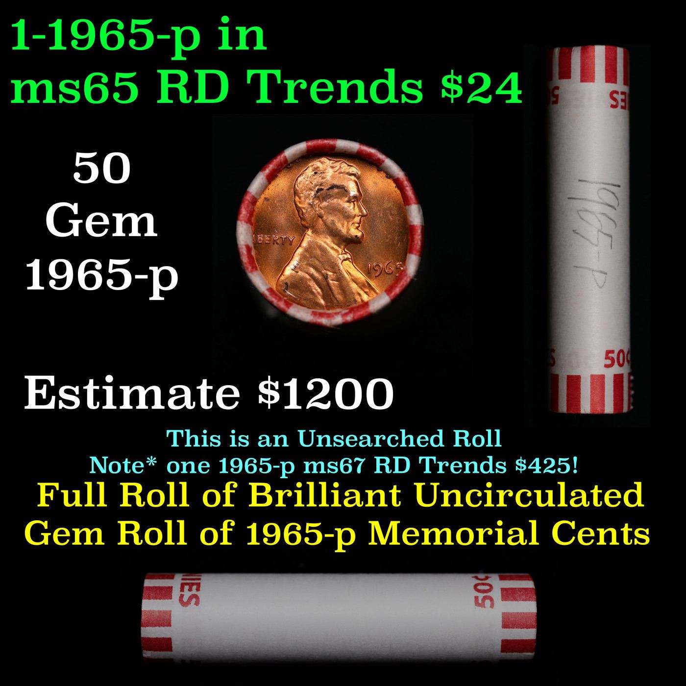 Shotgun Lincoln 1c roll, 1965-p 50 pcs Bank Wrapper.. A terrific Shotgun roll of Lincoln cents. Most if not all coin should be cherry red.