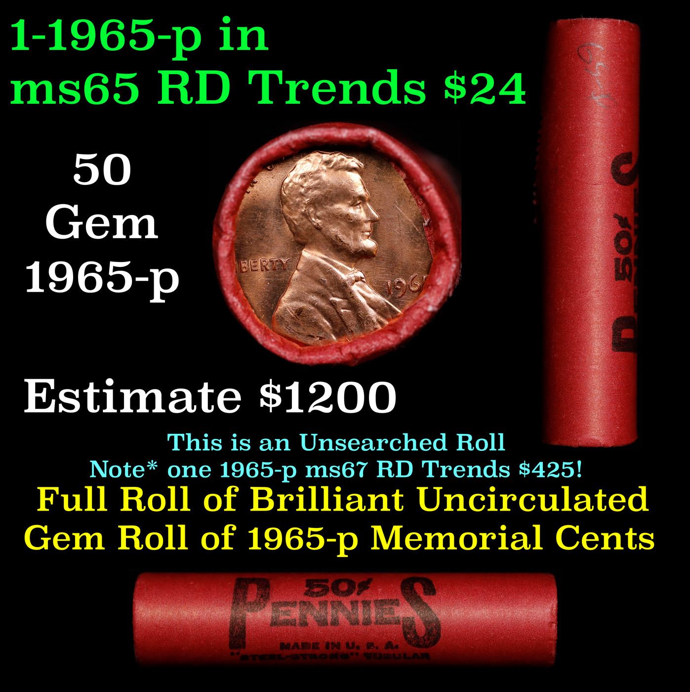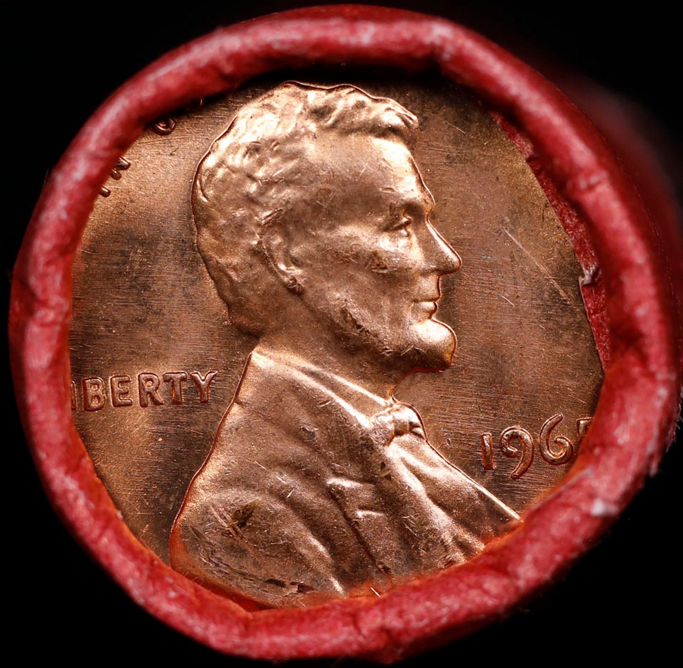 Shotgun Lincoln 1c roll, 1965-p 50 pcs Steel-Strong 50c Wrapper.. A terrific Shotgun roll of Lincoln cents. Most if not all coin should be cherry red.