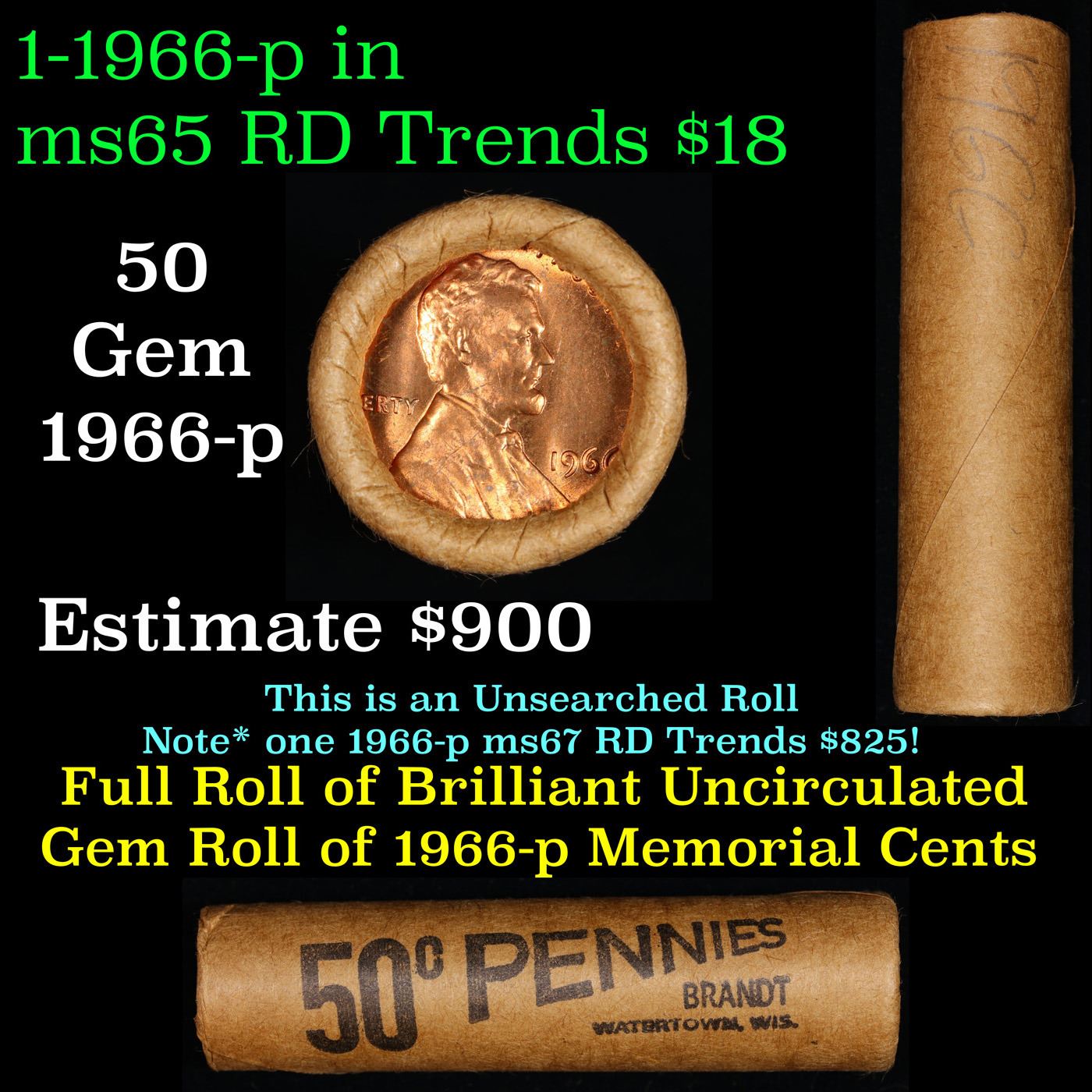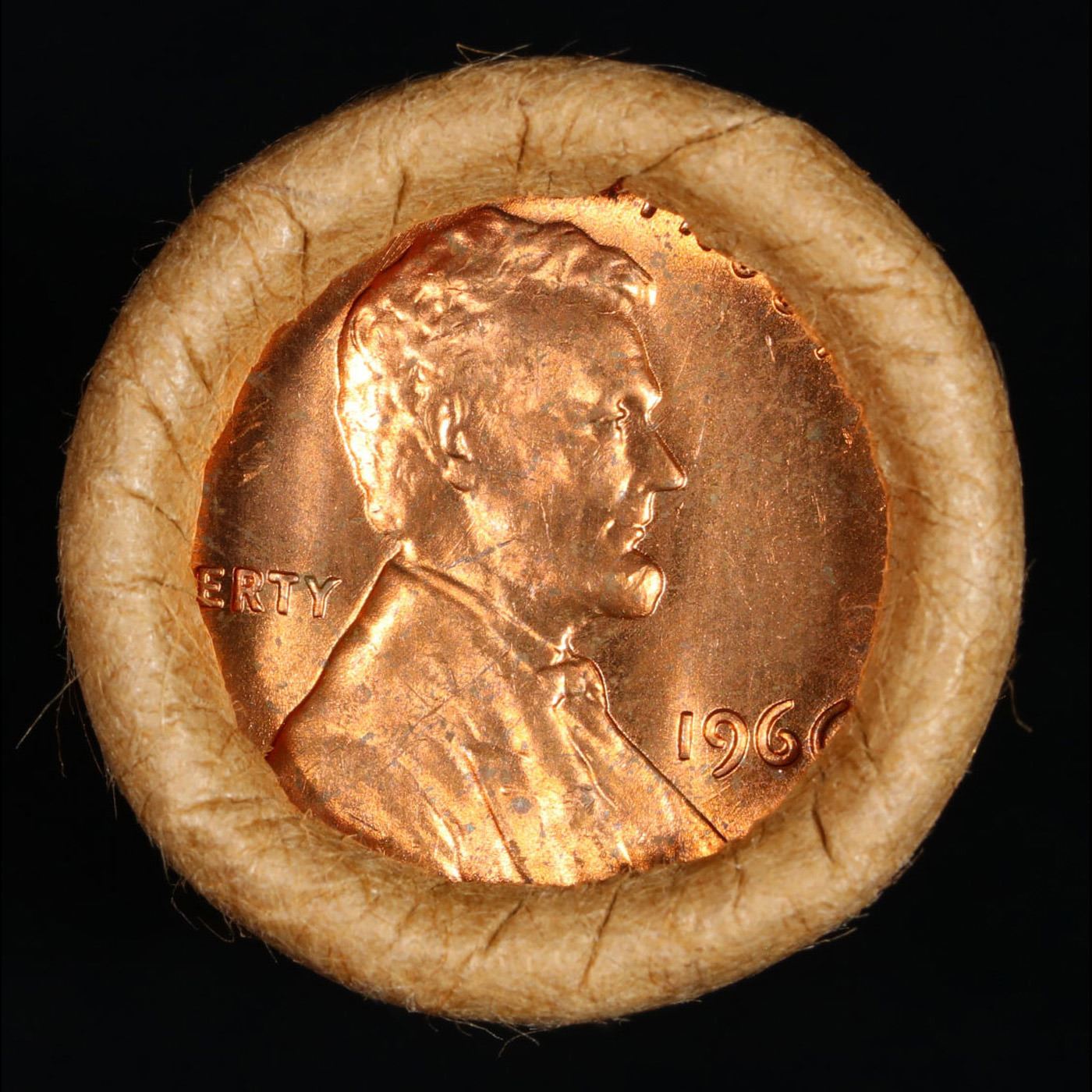 Shotgun Lincoln 1c roll, 1966-p 50 pcs Brandt Wrapper . A terrific Shotgun roll of Lincoln cents. All coins cherry red. Trends ms65 rd $18