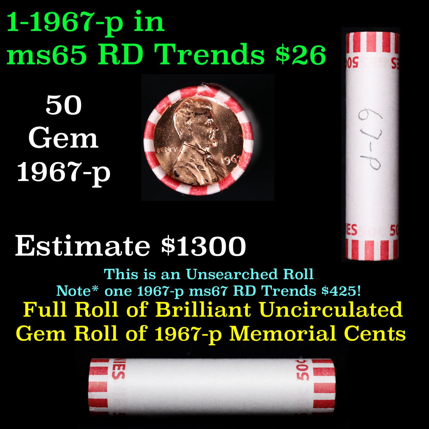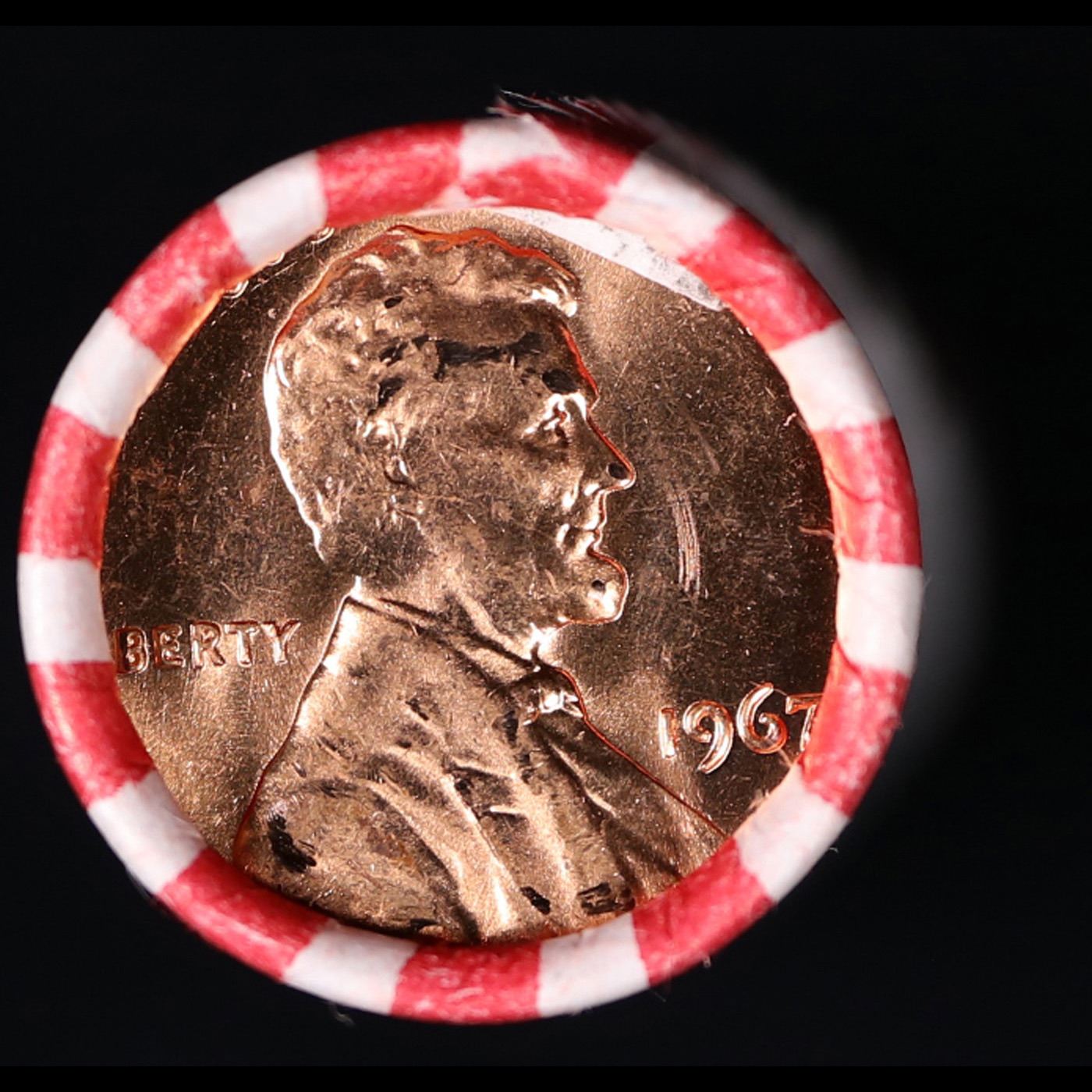 Shotgun Lincoln 1c roll, 1967-p 50 pcs Bank Wrapper.. A terrific Shotgun roll of Lincoln cents. Most if not all coin should be cherry red.