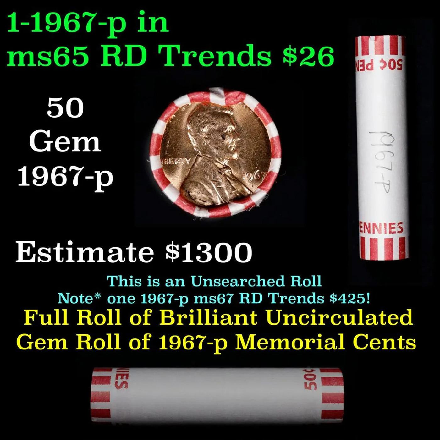 Shotgun Lincoln 1c roll, 1967-p 50 pcs Bank Wrapper.. A terrific Shotgun roll of Lincoln cents. Most if not all coin should be cherry red.