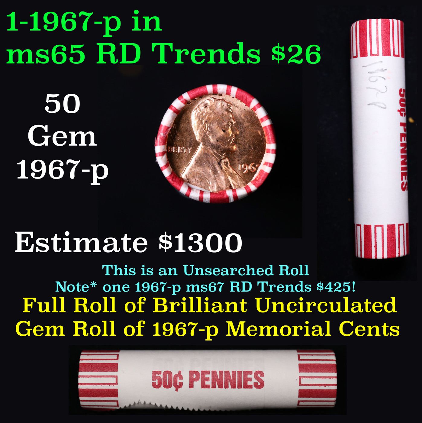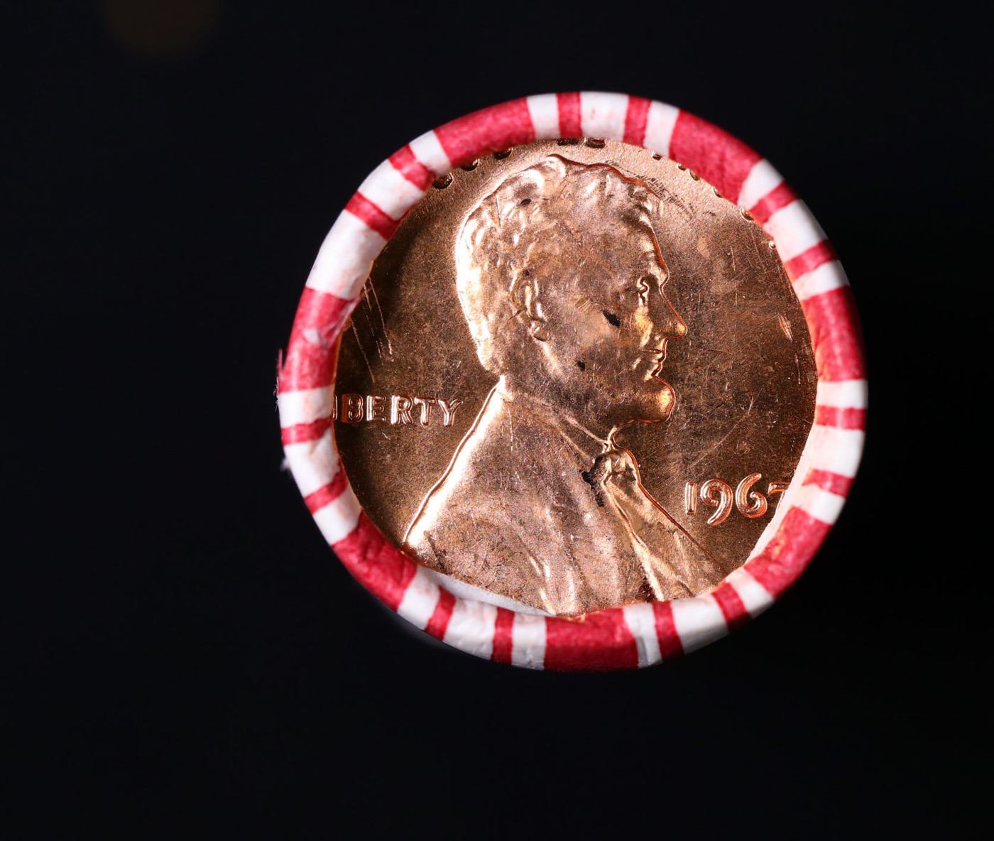 Shotgun Lincoln 1c roll, 1967-p 50 pcs Brandt 50c Wrapper.. A terrific Shotgun roll of Lincoln cents. Most if not all coin should be cherry red.