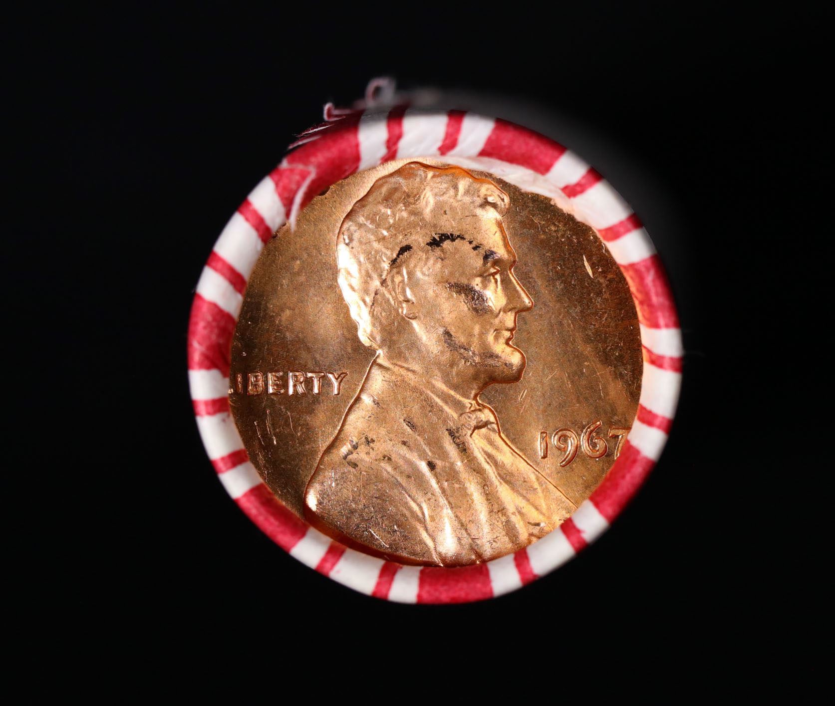 Shotgun Lincoln 1c roll, 1967-p 50 pcs Brandt 50c Wrapper.. A terrific Shotgun roll of Lincoln cents. Most if not all coin should be cherry red.