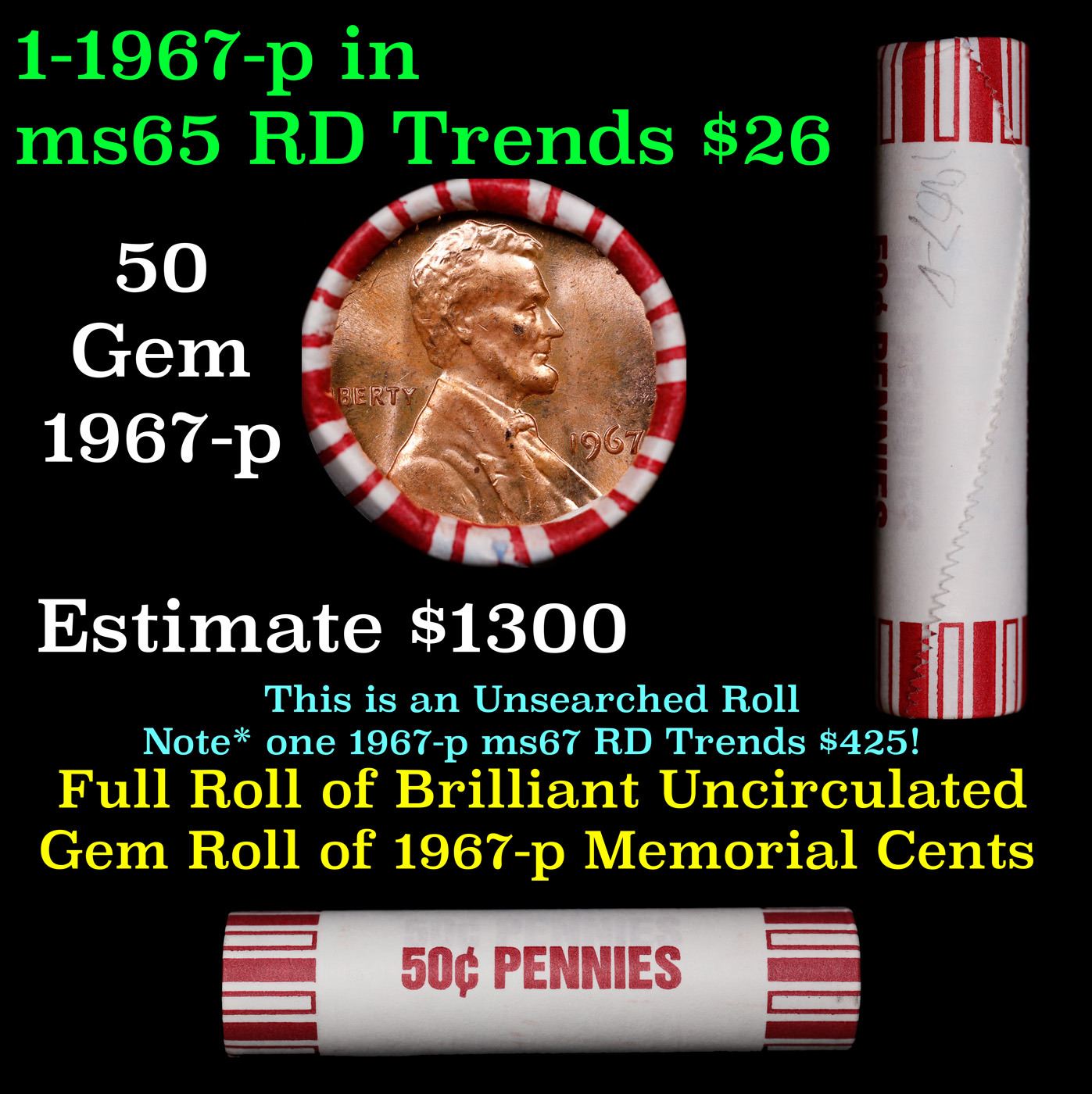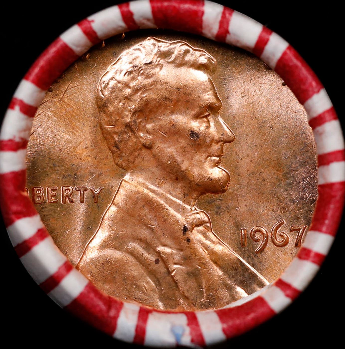 Shotgun Lincoln 1c roll, 1967-p 50 pcs Brandt 50c Wrapper.. A terrific Shotgun roll of Lincoln cents. Most if not all coin should be cherry red.
