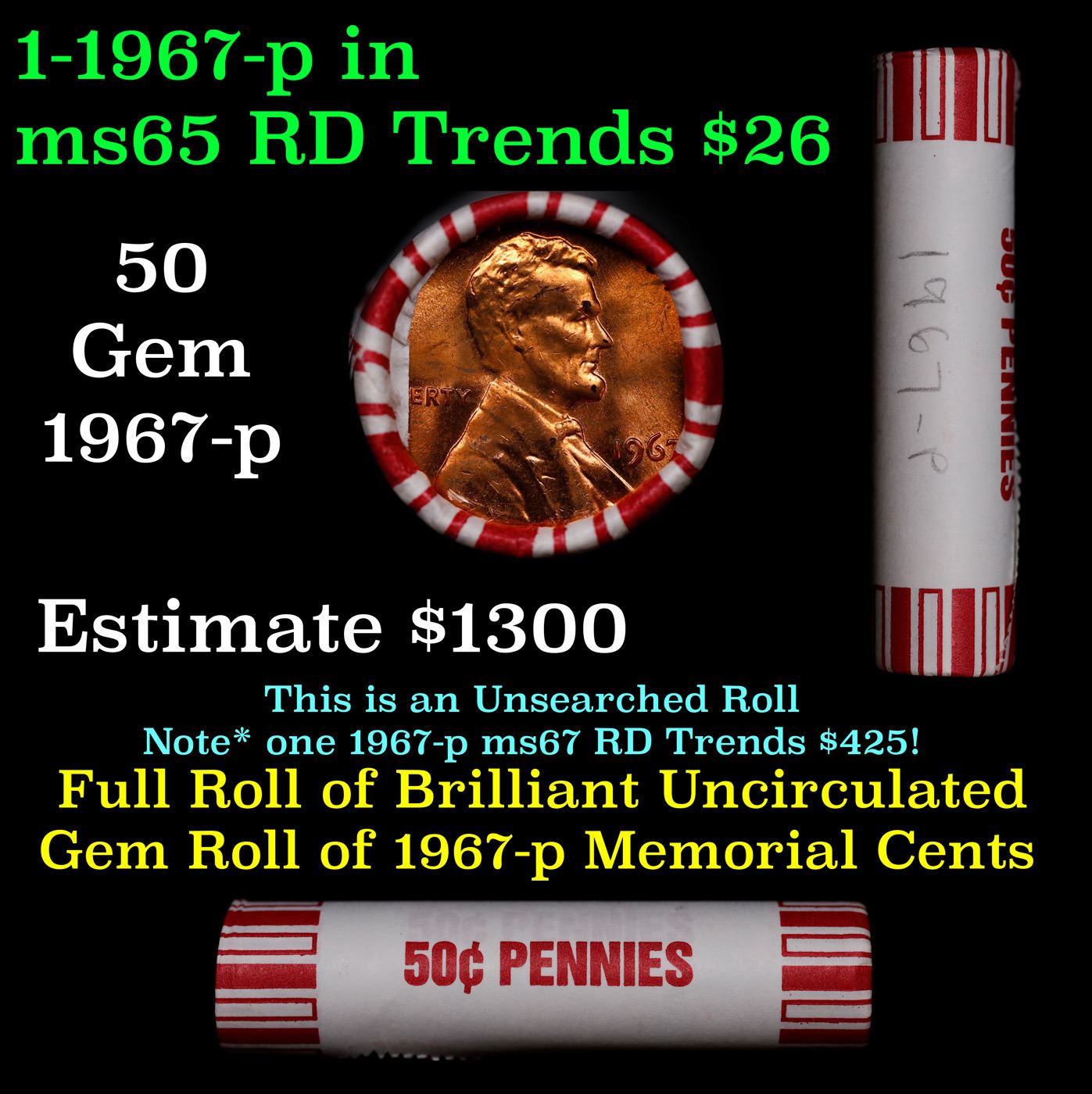 Shotgun Lincoln 1c roll, 1967-p 50 pcs Brandt 50c Wrapper.. A terrific Shotgun roll of Lincoln cents. Most if not all coin should be cherry red.