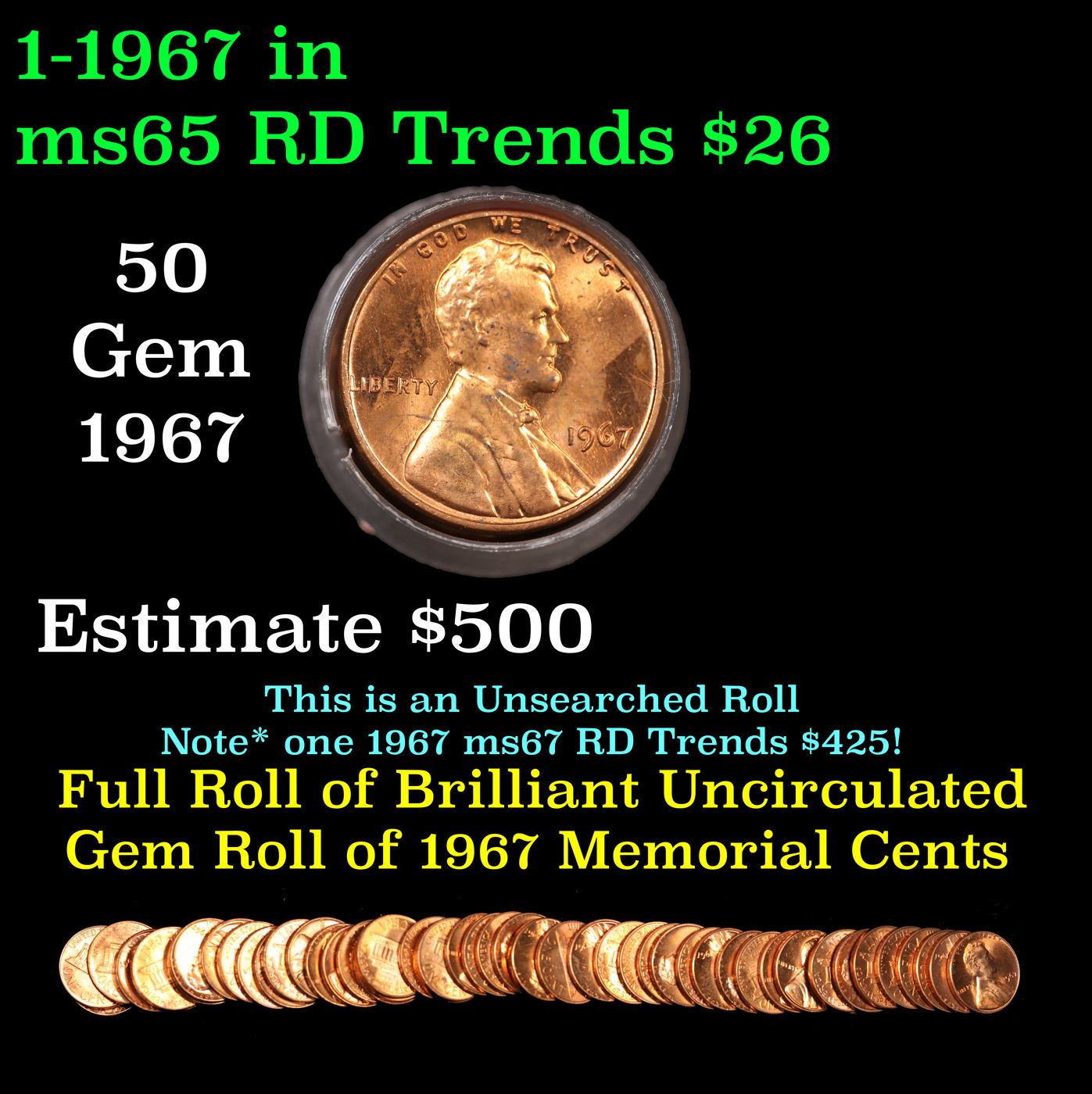 Shotgun Lincoln 1c roll, 1967-p 50 pcs Wrapper . A terrific Shotgun roll of Lincoln cents. All coins cherry red. Trends ms65 rd $12