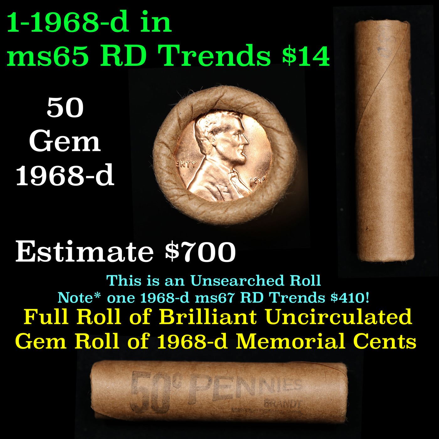 Shotgun Lincoln 1c roll, 1968-d 50 pcs Brandt Wrapper.. A terrific Shotgun roll of Lincoln cents. Most if not all coin should be cherry red. Trends ms65 rd $14