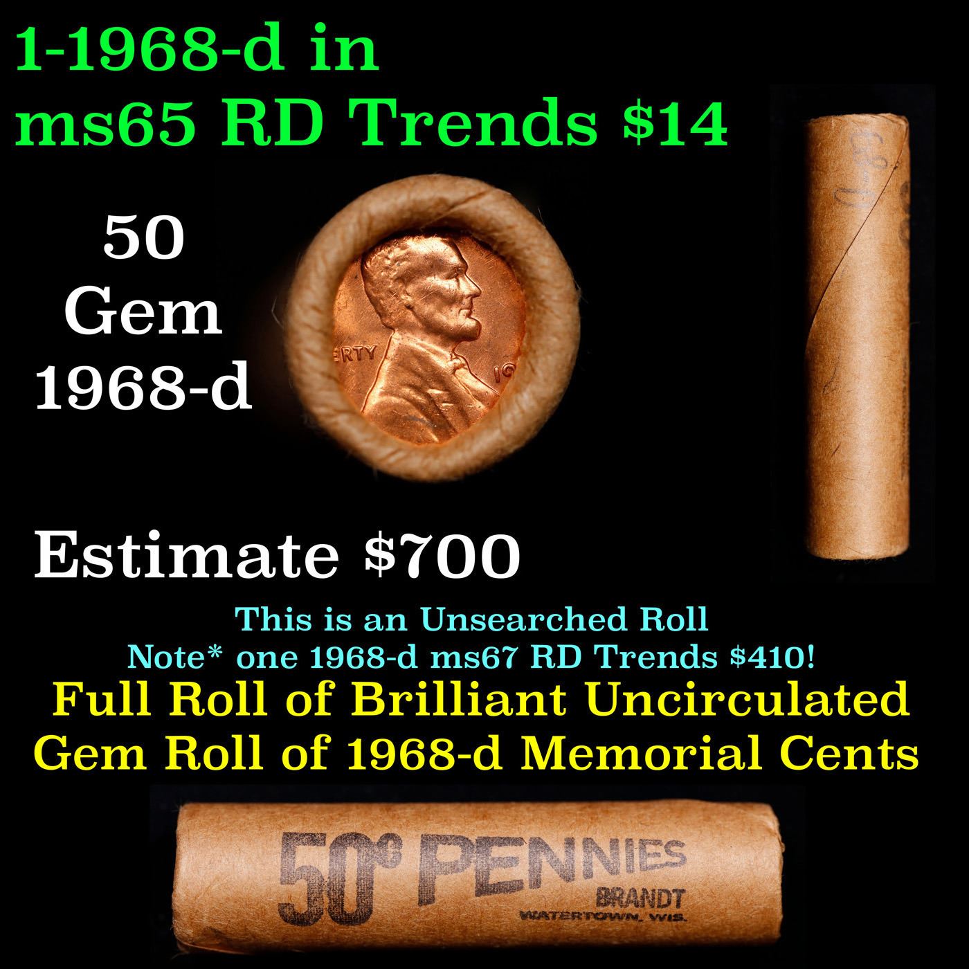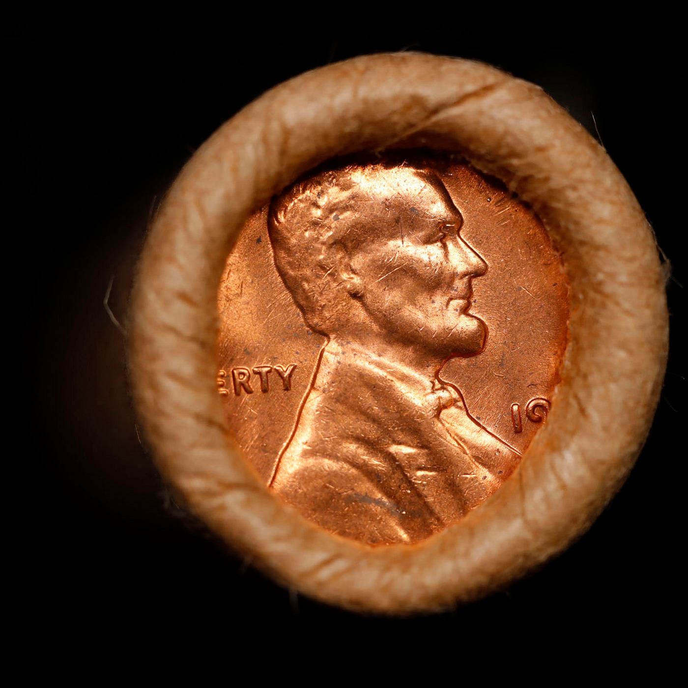 Shotgun Lincoln 1c roll, 1968-d 50 pcs Brandt Wrapper.. A terrific Shotgun roll of Lincoln cents. Most if not all coin should be cherry red.