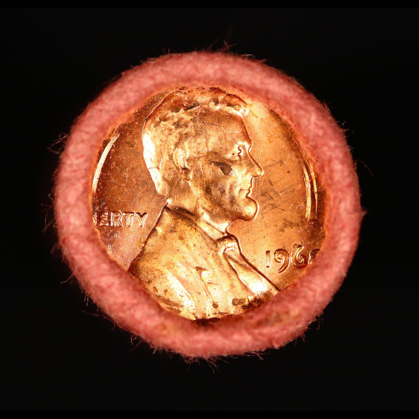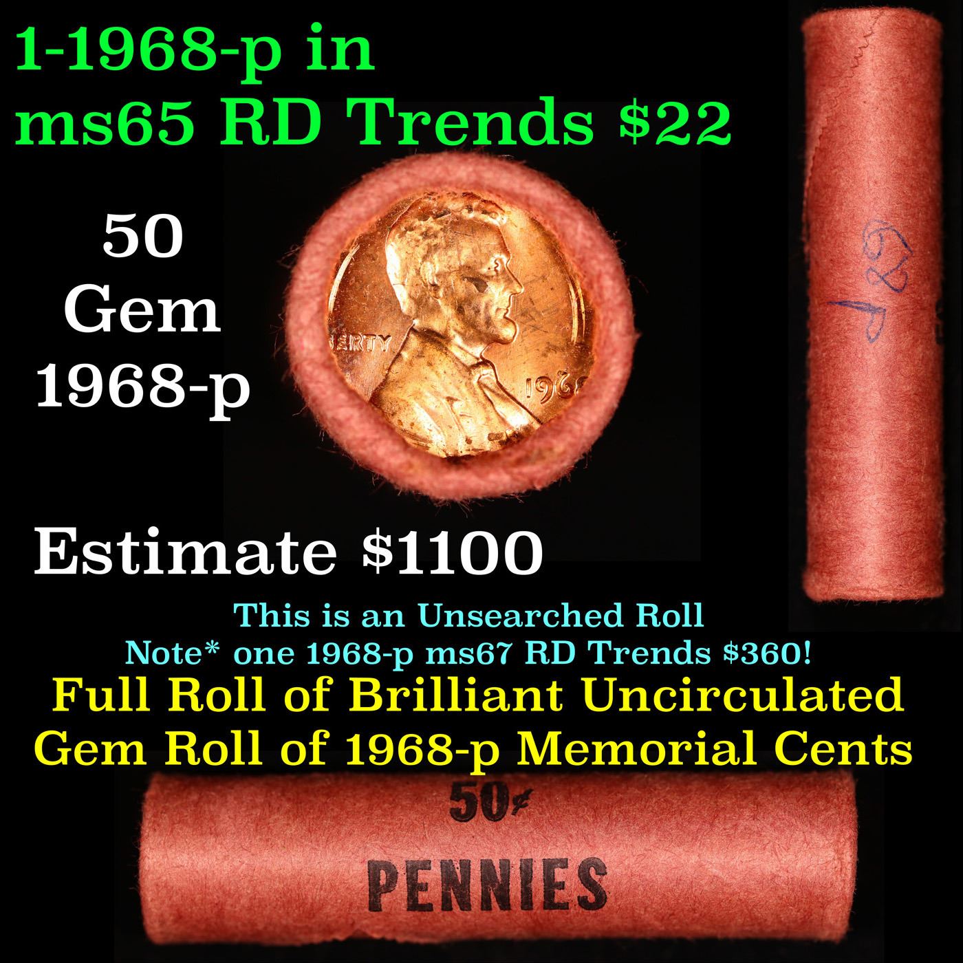 Shotgun Lincoln 1c roll, 1968-p 50 pcs Old Bank Wrapper. A terrific Shotgun roll of Lincoln cents. All coins cherry red. Trends ms65 rd $16