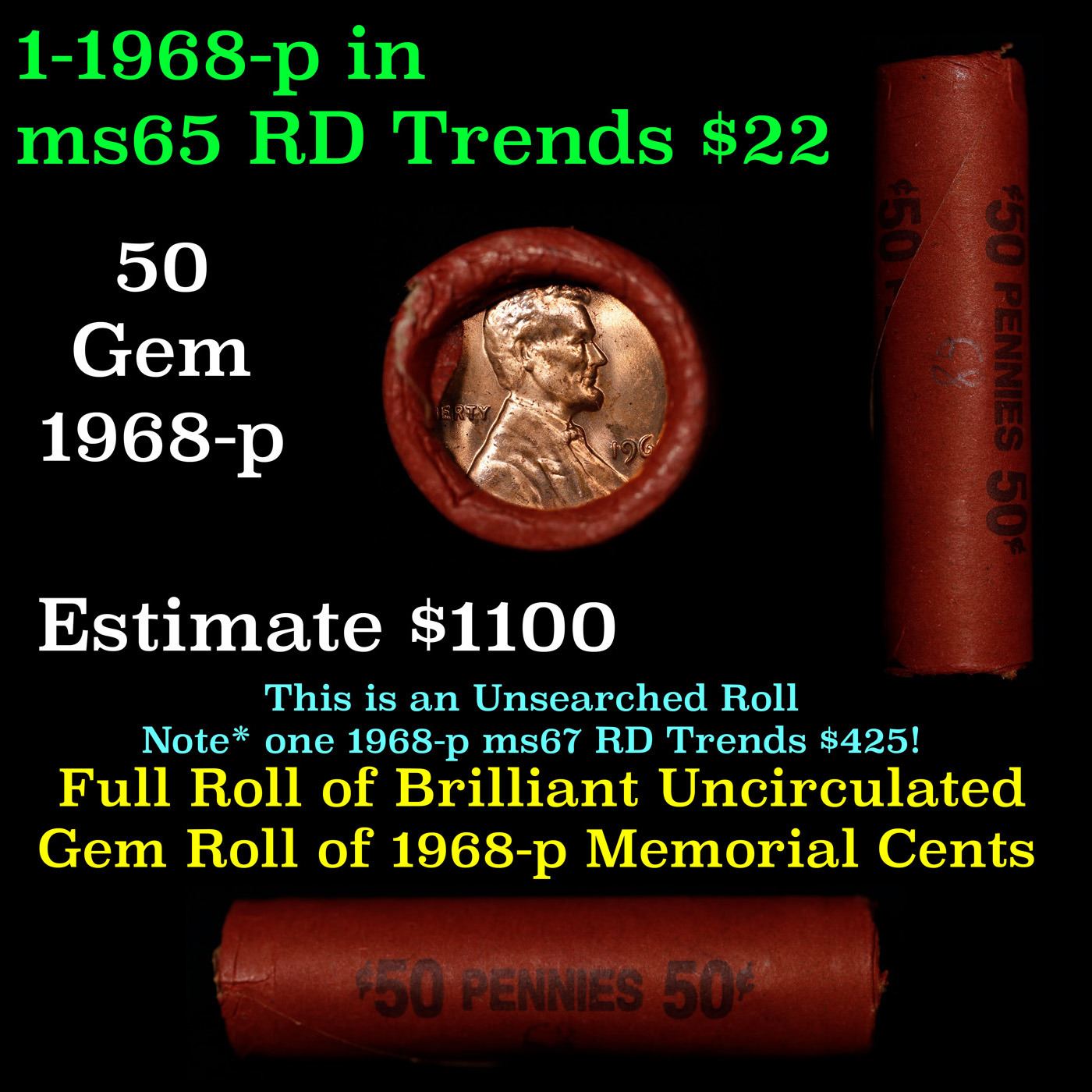 Shotgun Lincoln 1c roll, 1968-p 50 pcs Wrapper.. A terrific Shotgun roll of Lincoln cents. Most if not all coin should be cherry red. Trends ms65 rd $22