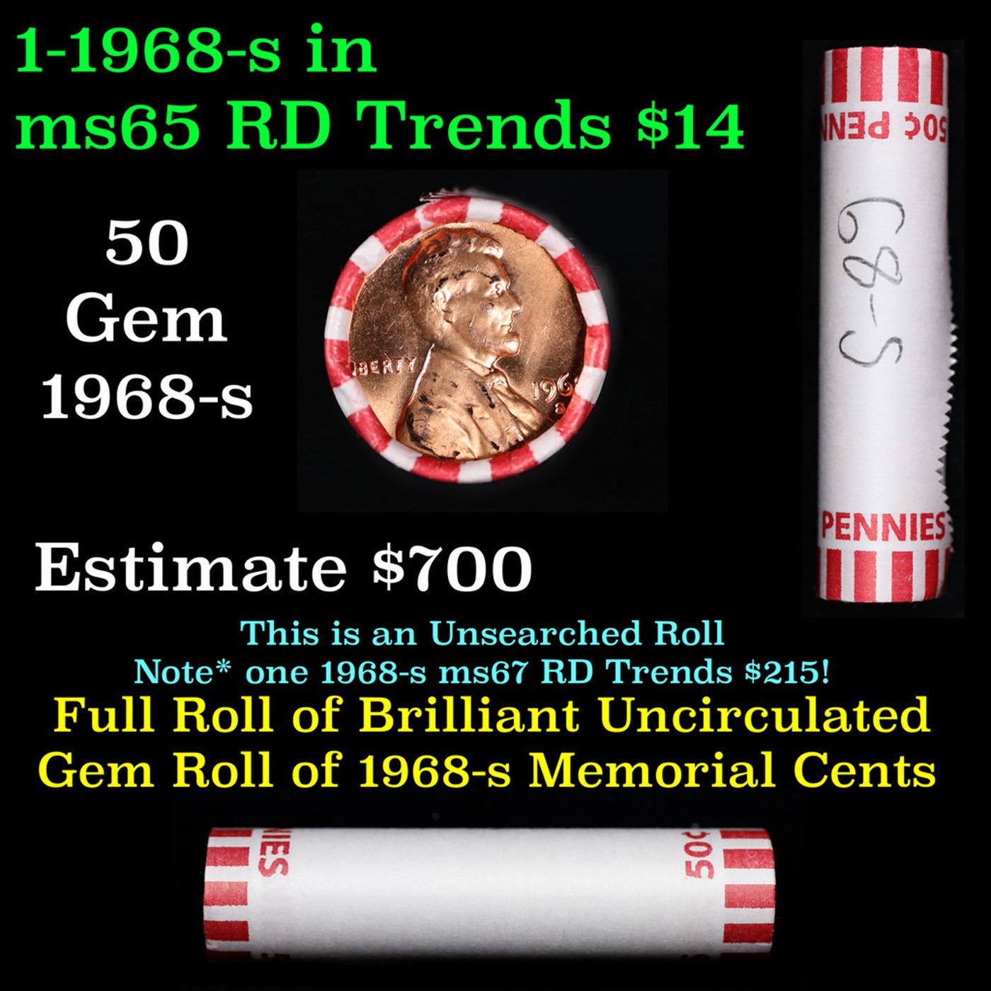 Shotgun Lincoln 1c roll, 1968-s 50 pcs Bank Wrapper.. A terrific Shotgun roll of Lincoln cents. Most if not all coin should be cherry red.
