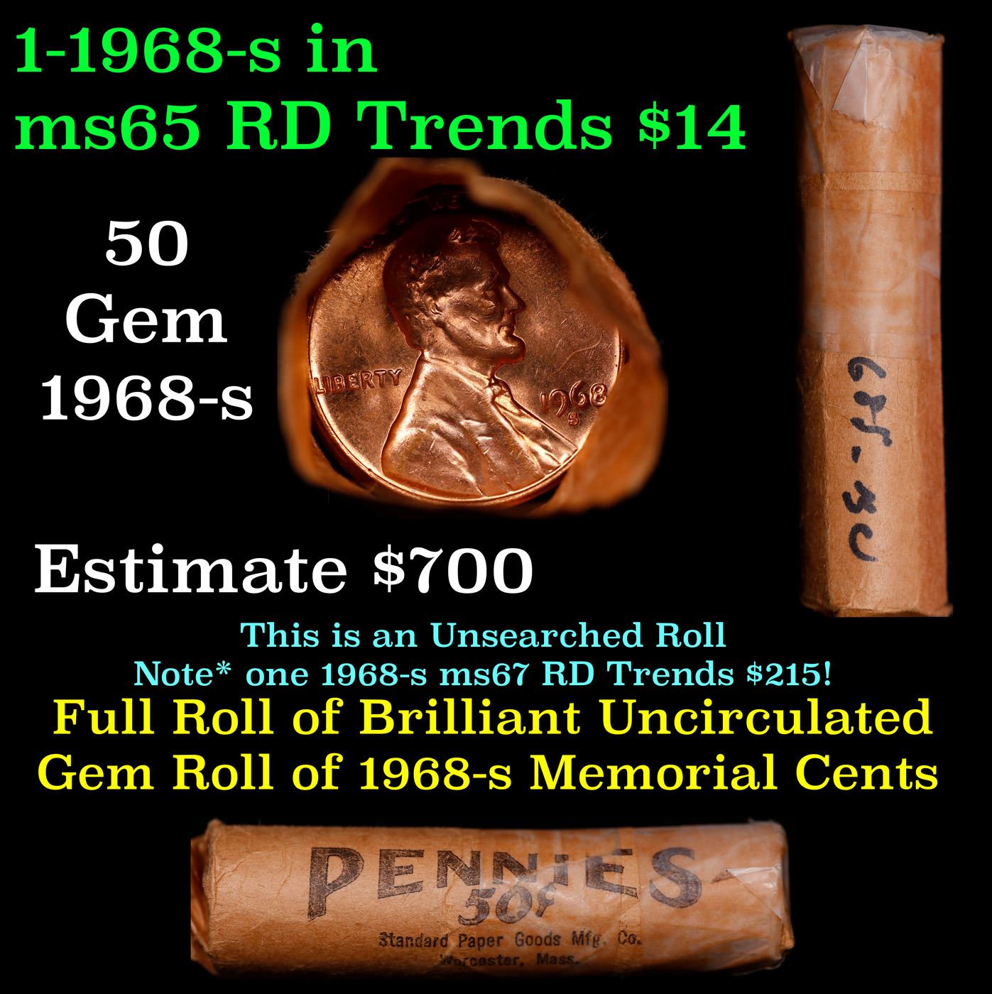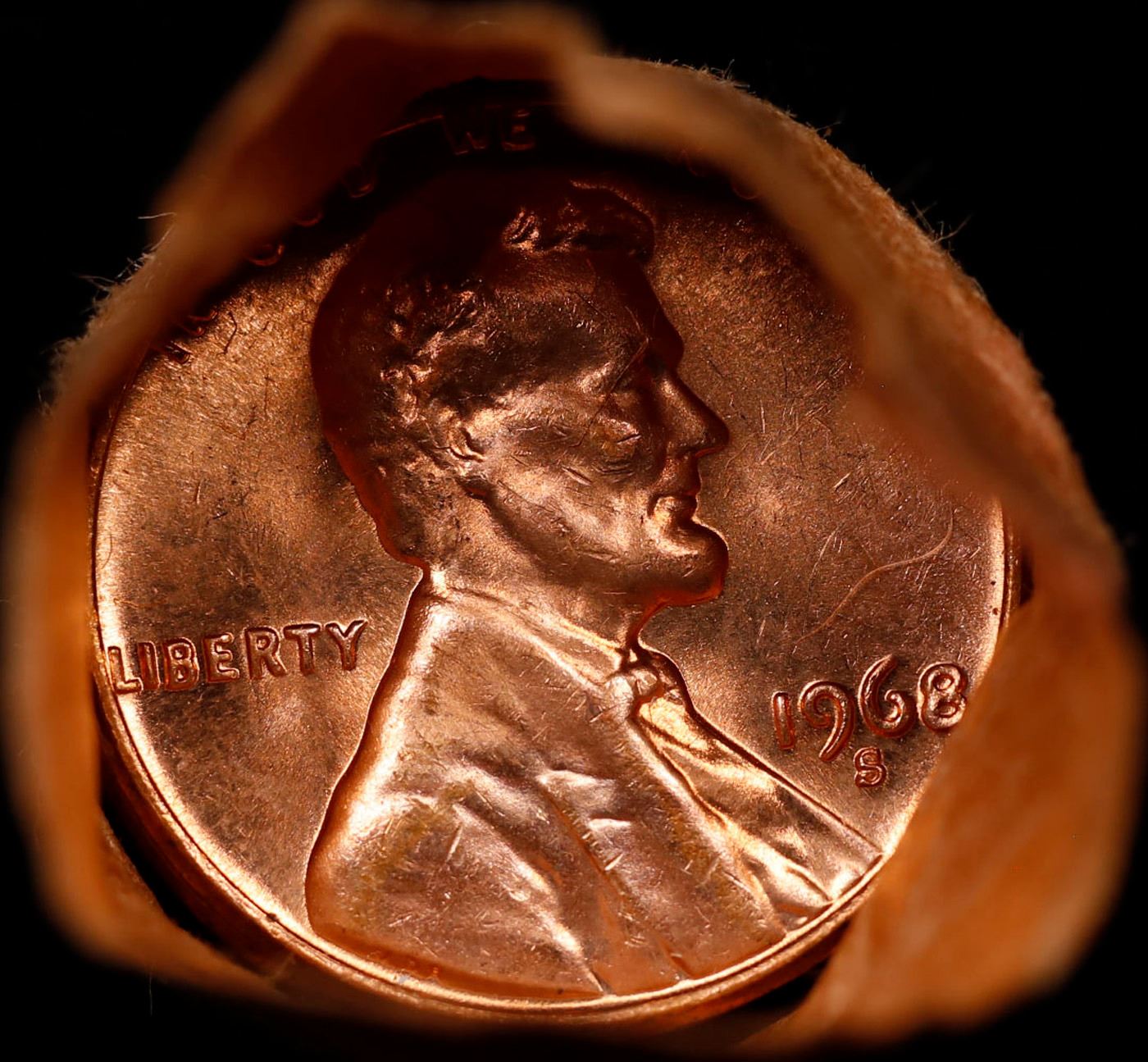 Shotgun Lincoln 1c roll, 1968-s 50 pcs Bank Wrapper.. A terrific Shotgun roll of Lincoln cents. Most if not all coin should be cherry red.