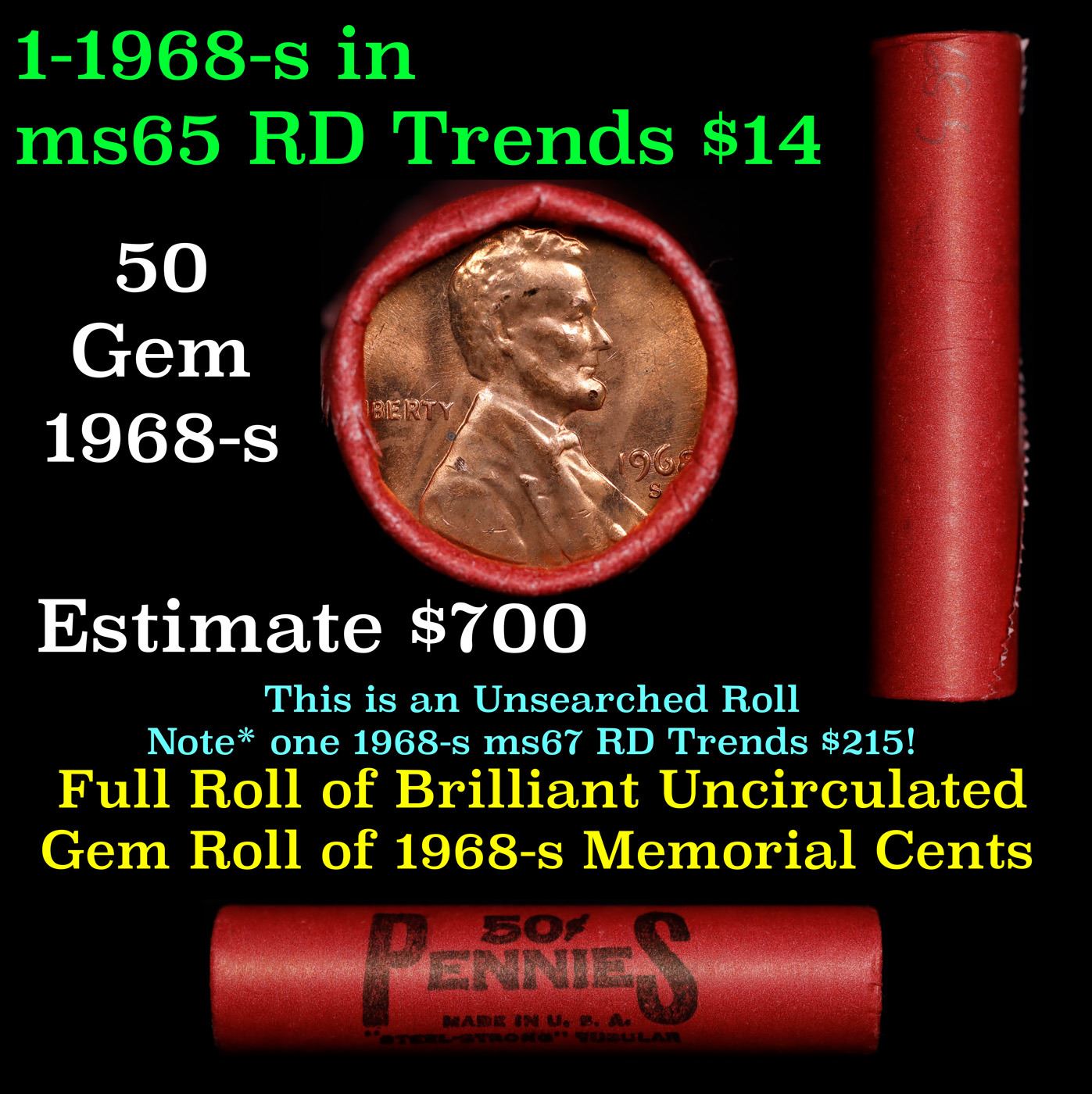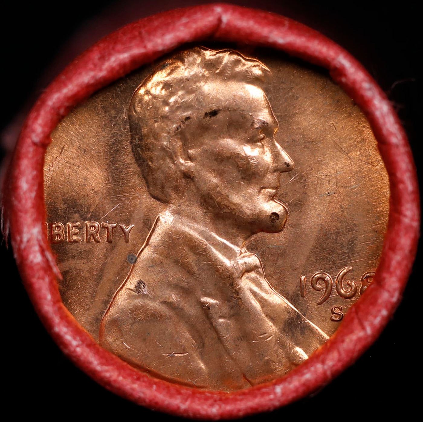 Shotgun Lincoln 1c roll, 1968-s 50 pcs Steel-Strong 50c Wrapper.. A terrific Shotgun roll of Lincoln cents. Most if not all coin should be cherry red.