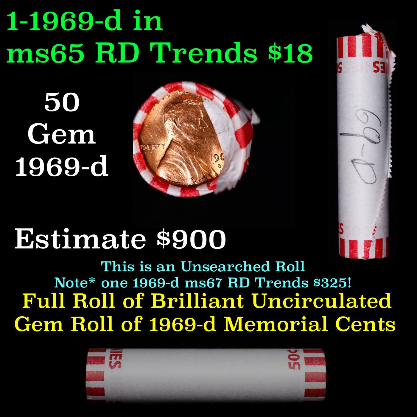 Shotgun Lincoln 1c roll, 1969-d 50 pcs Bank Wrapper.. A terrific Shotgun roll of Lincoln cents. Most if not all coin should be cherry red.