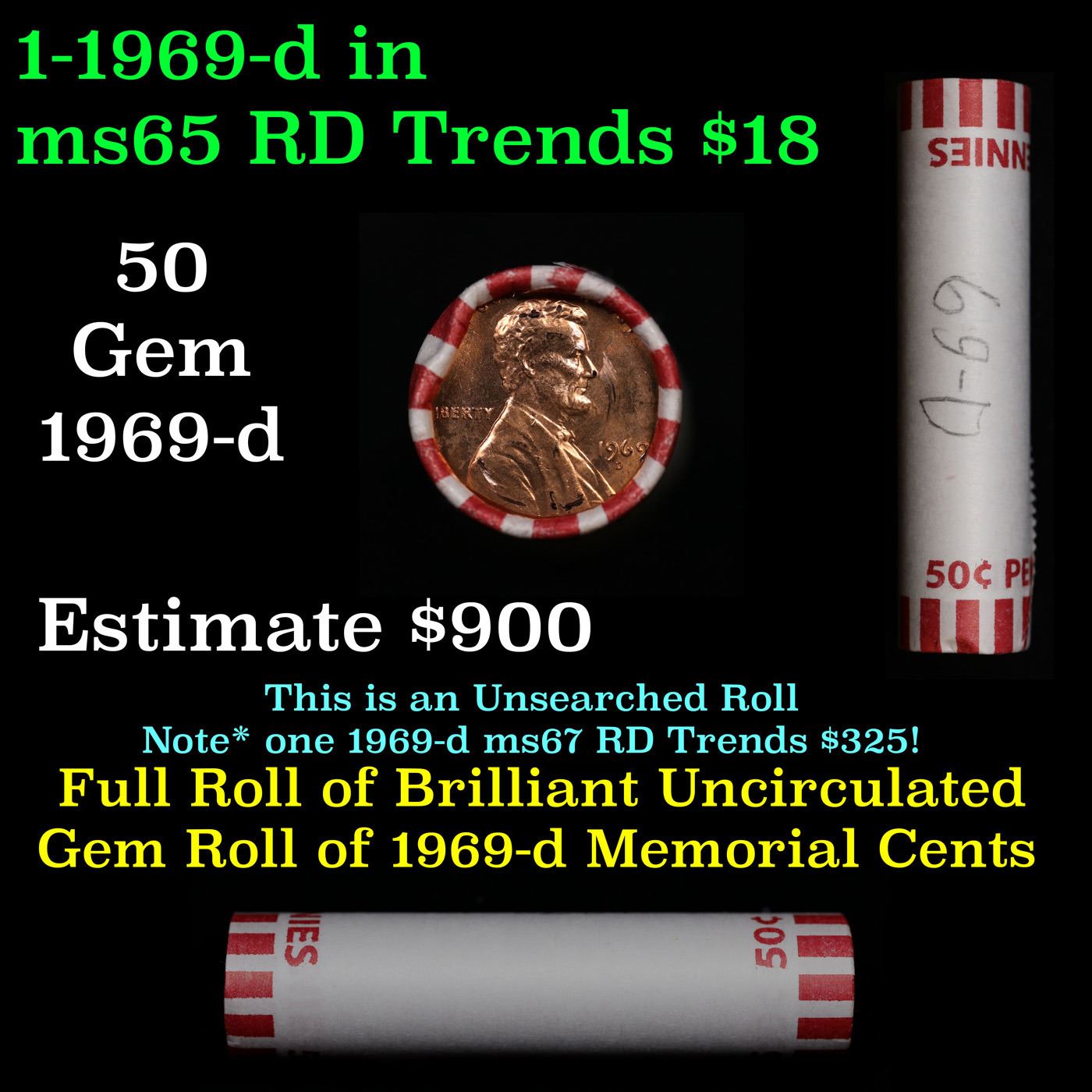 Shotgun Lincoln 1c roll, 1969-d 50 pcs Bank Wrapper.. A terrific Shotgun roll of Lincoln cents. Most if not all coin should be cherry red.