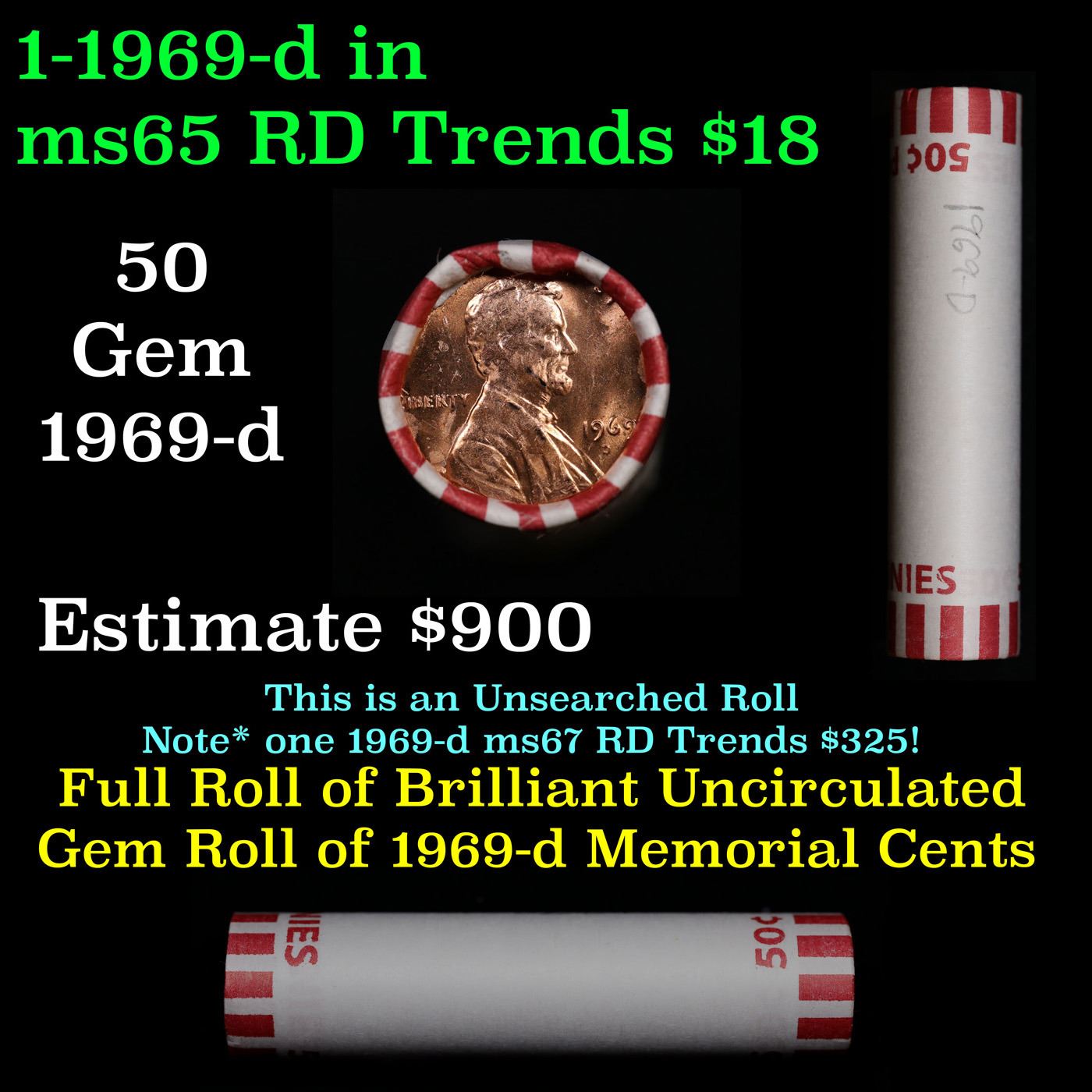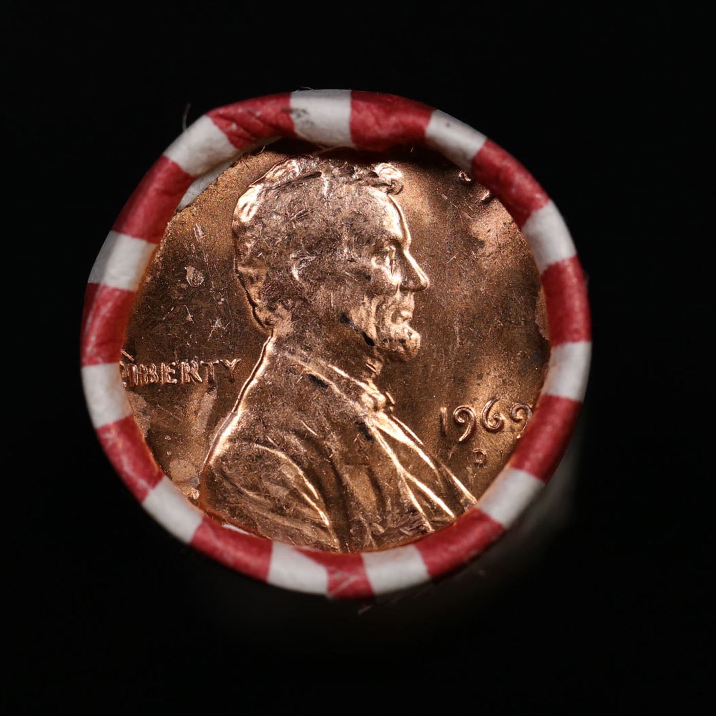 Shotgun Lincoln 1c roll, 1969-d 50 pcs Bank Wrapper.. A terrific Shotgun roll of Lincoln cents. Most if not all coin should be cherry red.