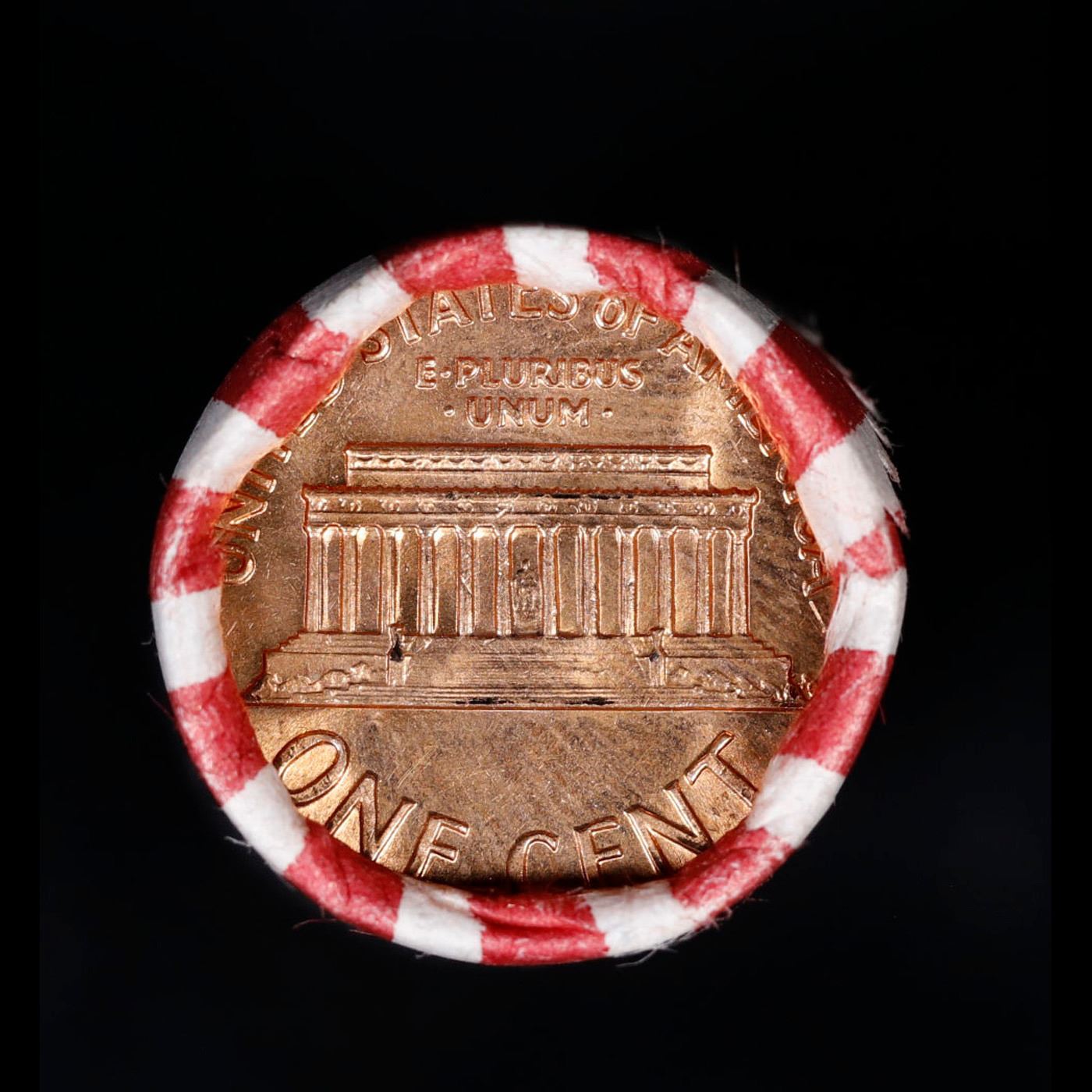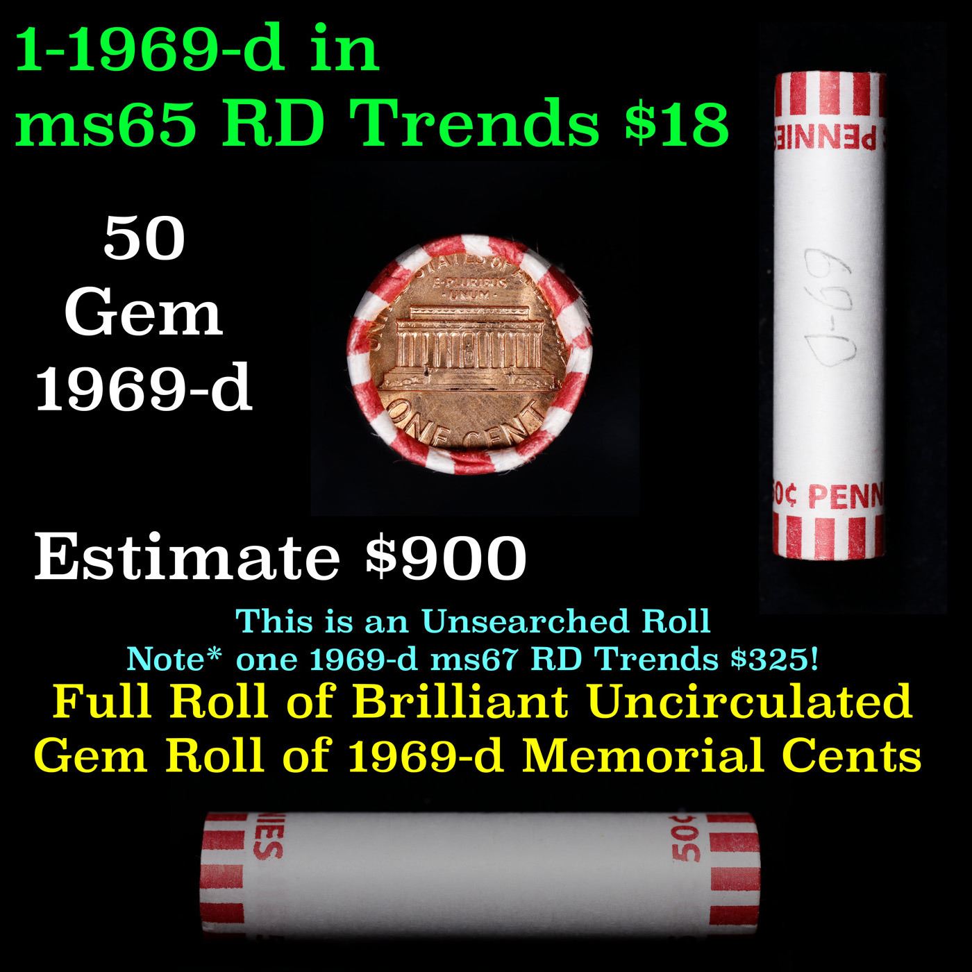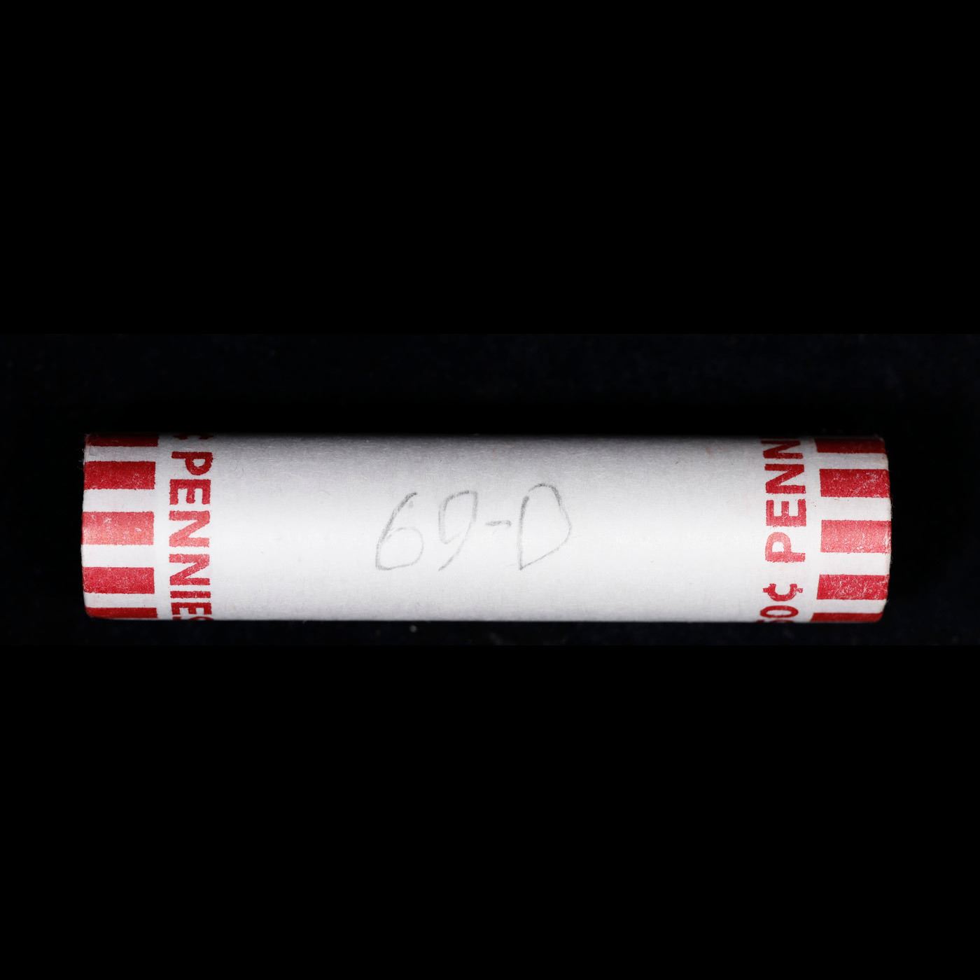 Shotgun Lincoln 1c roll, 1969-d 50 pcs Bank Wrapper.. A terrific Shotgun roll of Lincoln cents. Most if not all coin should be cherry red.