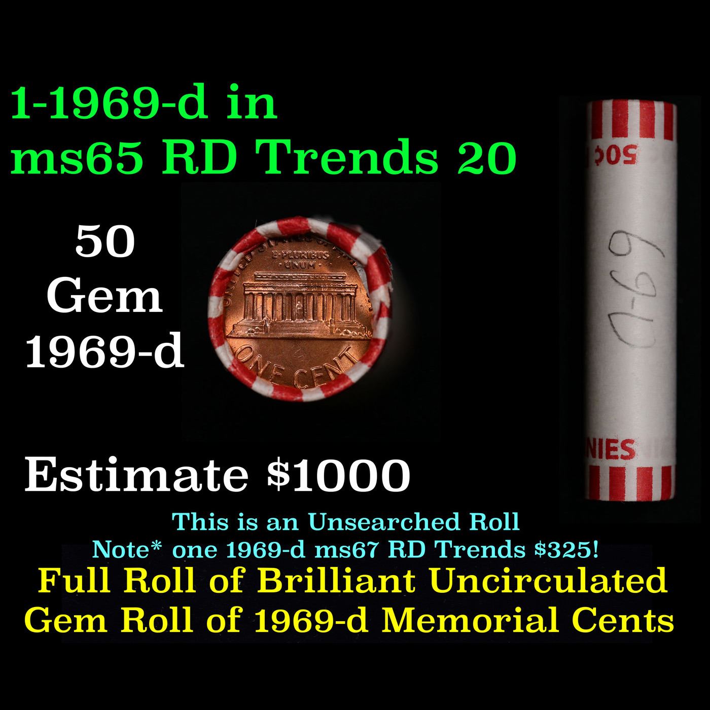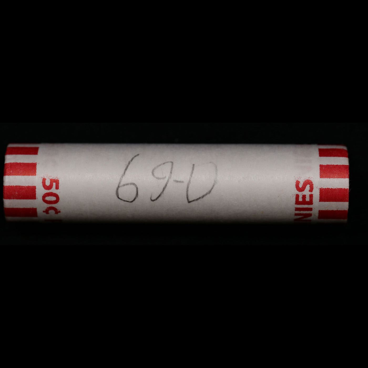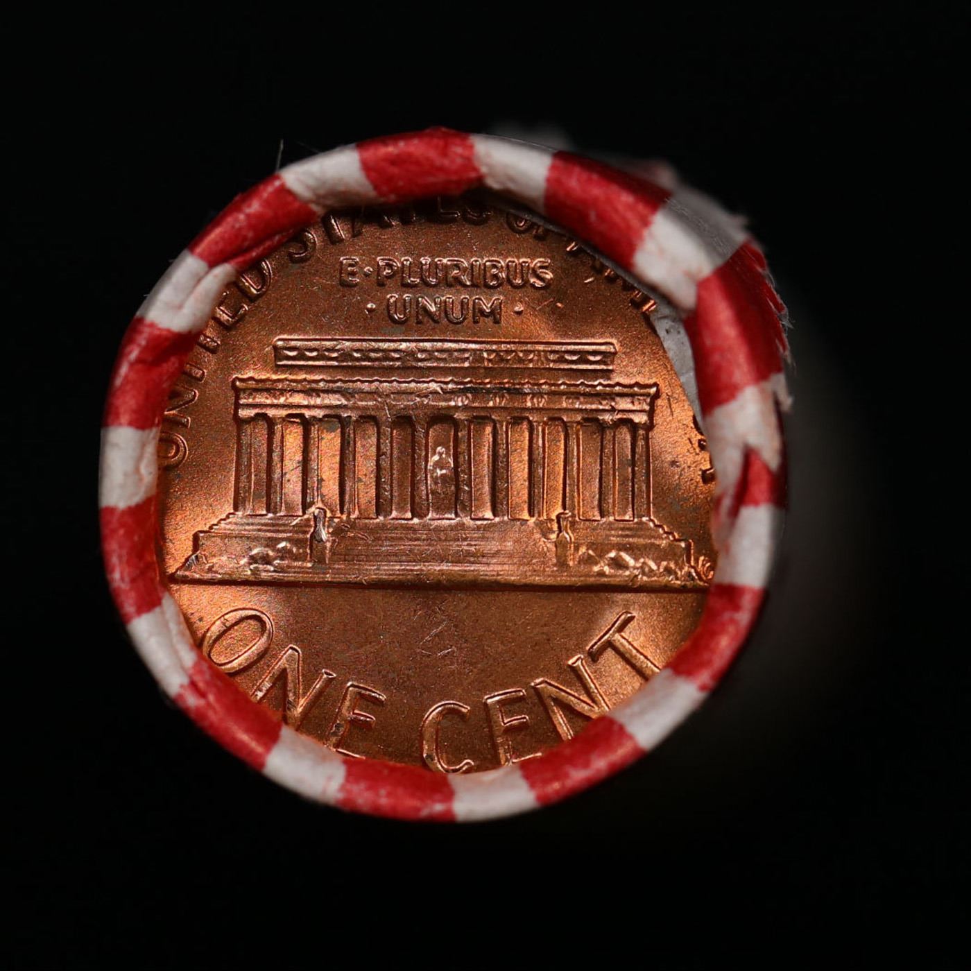 Shotgun Lincoln 1c roll, 1969-d 50 pcs Bank Wrapper.. A terrific Shotgun roll of Lincoln cents. Most if not all coin should be cherry red.