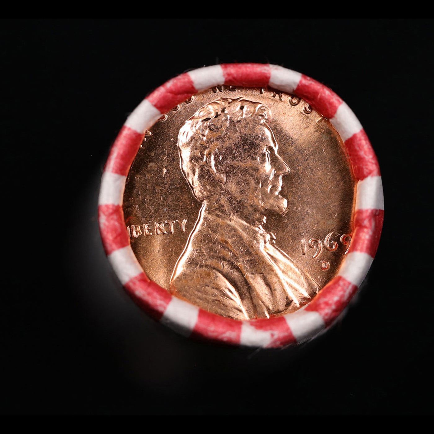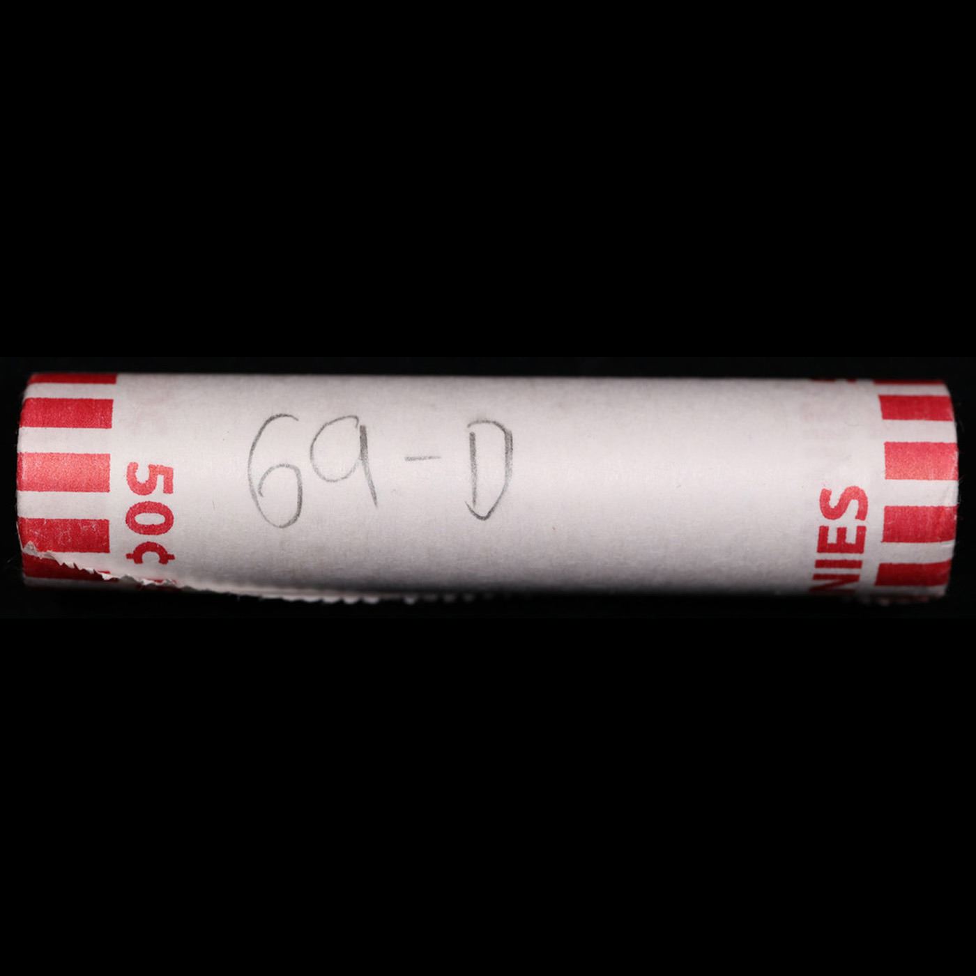 Shotgun Lincoln 1c roll, 1969-d 50 pcs Bank Wrapper.. A terrific Shotgun roll of Lincoln cents. Most if not all coin should be cherry red.