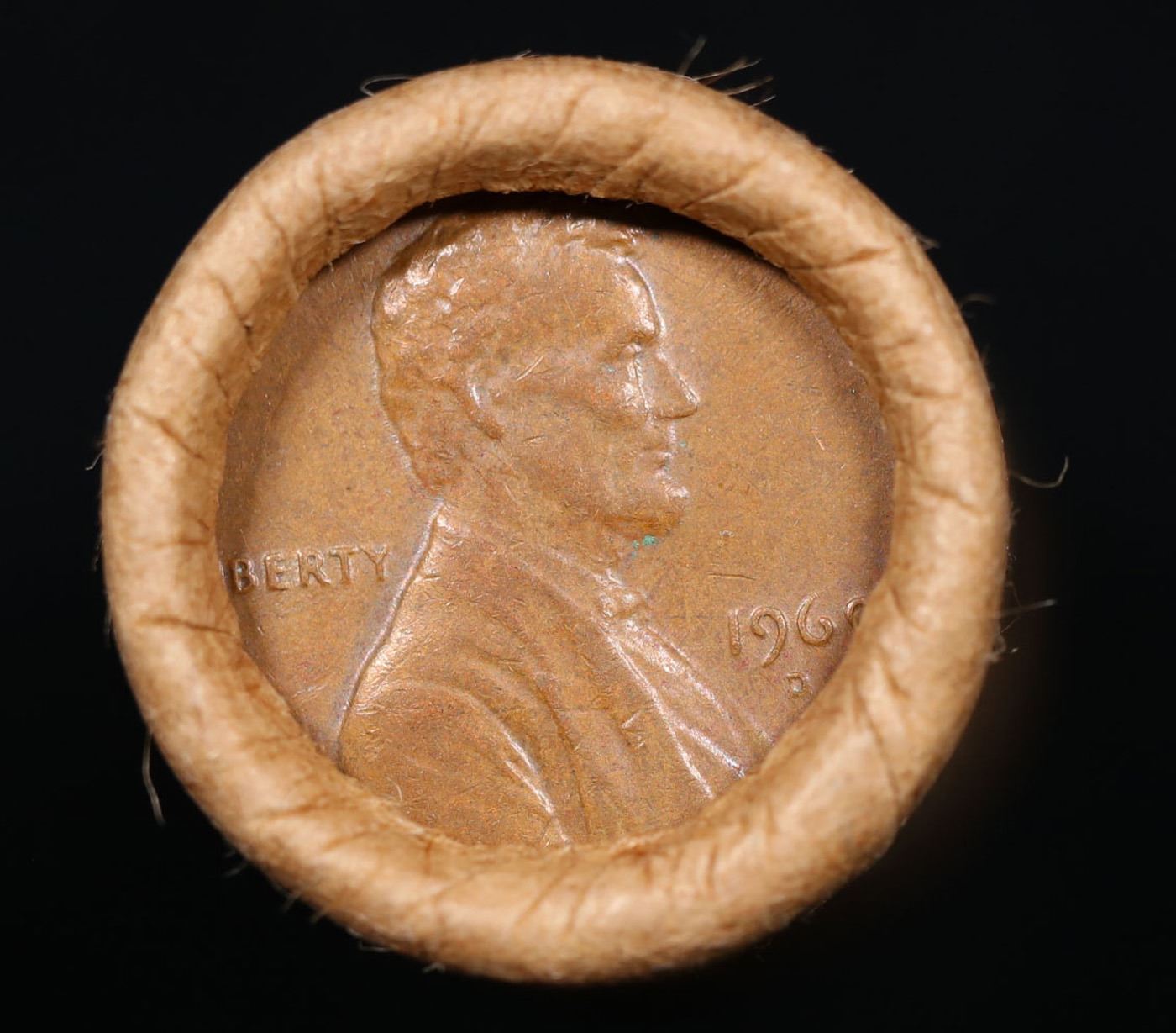 Shotgun Lincoln 1c roll, 1969-d 50 pcs Brandt Wrapper . A terrific Shotgun roll of Lincoln cents. All coins appear to be cherry red. Trends ms65 rd $16