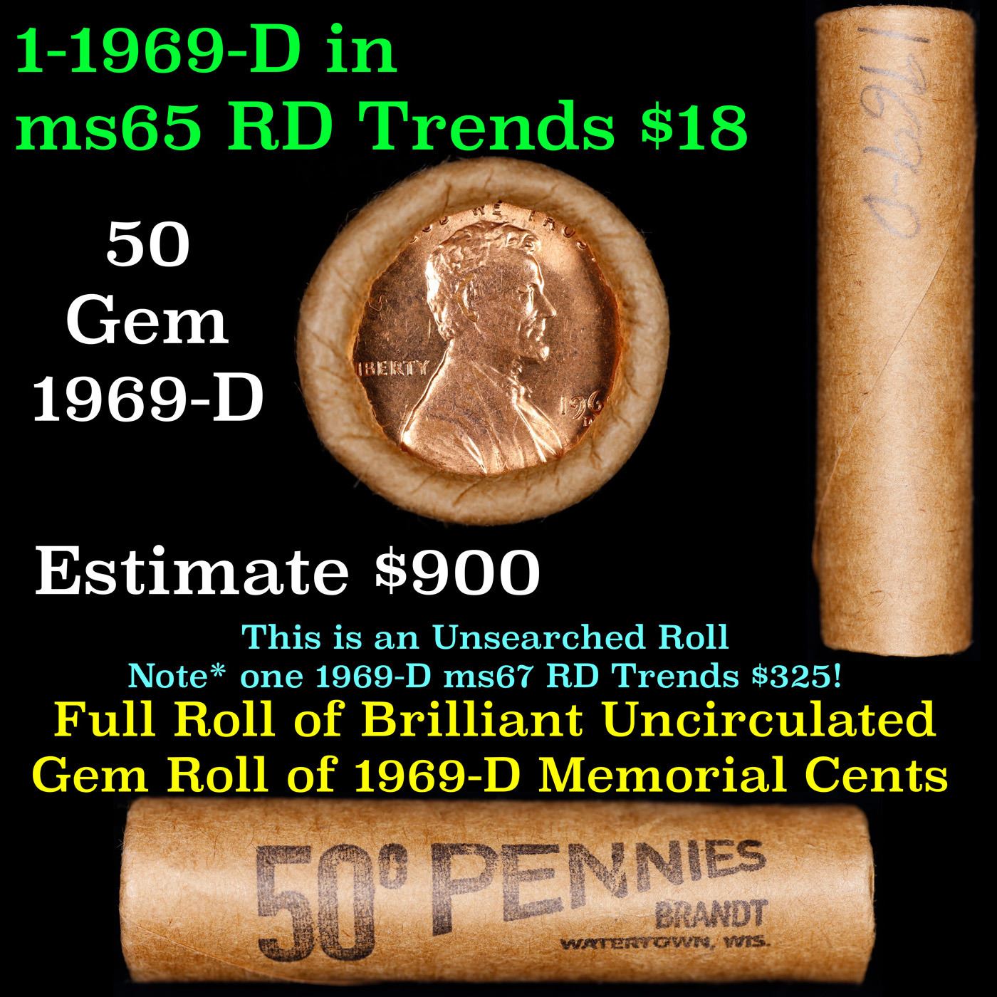 Shotgun Lincoln 1c roll, 1969-d 50 pcs Brandt Wrapper . A terrific Shotgun roll of Lincoln cents. All coins appear to be cherry red. Trends ms65 rd $16