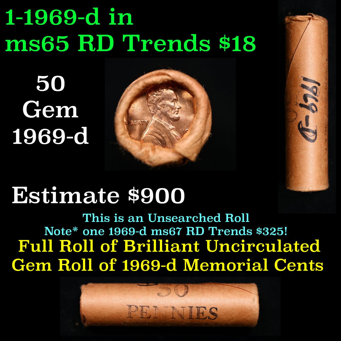 Shotgun Lincoln 1c roll, 1969-d 50 pcs Brandt Wrapper.. A terrific Shotgun roll of Lincoln cents. Most if not all coin should be cherry red.
