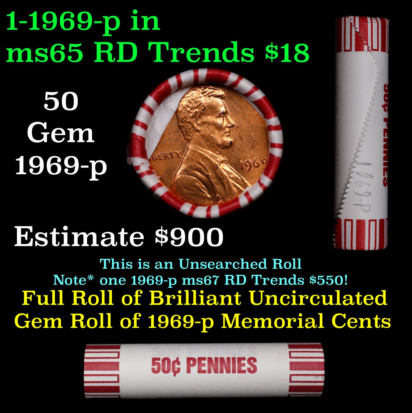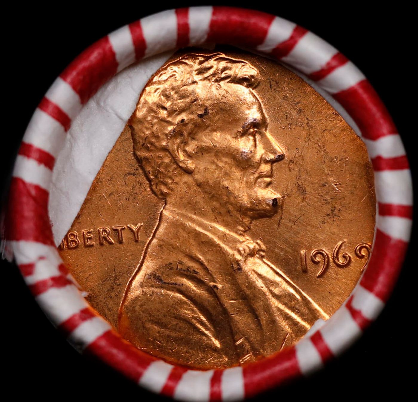Shotgun Lincoln 1c roll, 1969-p 50 pcs Brandt 50c Wrapper.. A terrific Shotgun roll of Lincoln cents. Most if not all coin should be cherry red.