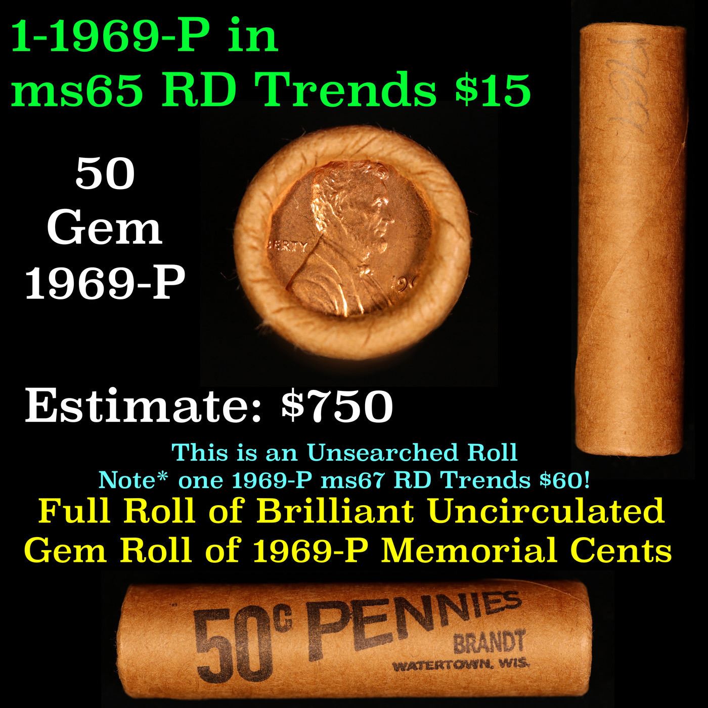 Shotgun Lincoln 1c roll, 1969-p 50 pcs Brandt Wrapper . A terrific Shotgun roll of Lincoln cents. All coins cherry red. Trends ms65 rd $18